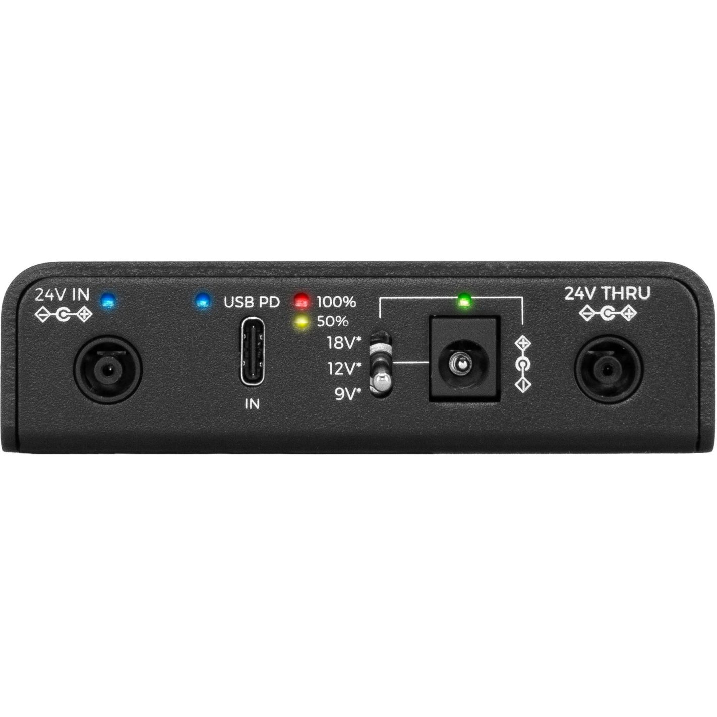 Fuente de alimentación Walrus Audio Canvas Power USB - Conversor compacto que permite usar fuentes de alimentación de pedales estándar con cargadores USB Power Delivery (mínimo 30 W) de ordenadores, móviles o power banks. Funciona como puente entre fuentes de 24 V EIAJ (Strymon Zuma, Cioks DC7, Walrus Canvas Power) y cargadores USB, con conmutación inteligente que prioriza adaptador de CC o entrada USB PD según disponibilidad. Salida aislada y filtrada de bajo ruido con voltaje seleccionable 9/12/18 V hasta 500 mA (375 mA en 12 V, 250 mA en 18 V). Diseño ultradelgado (94 x 54 x 24,5 mm, 136