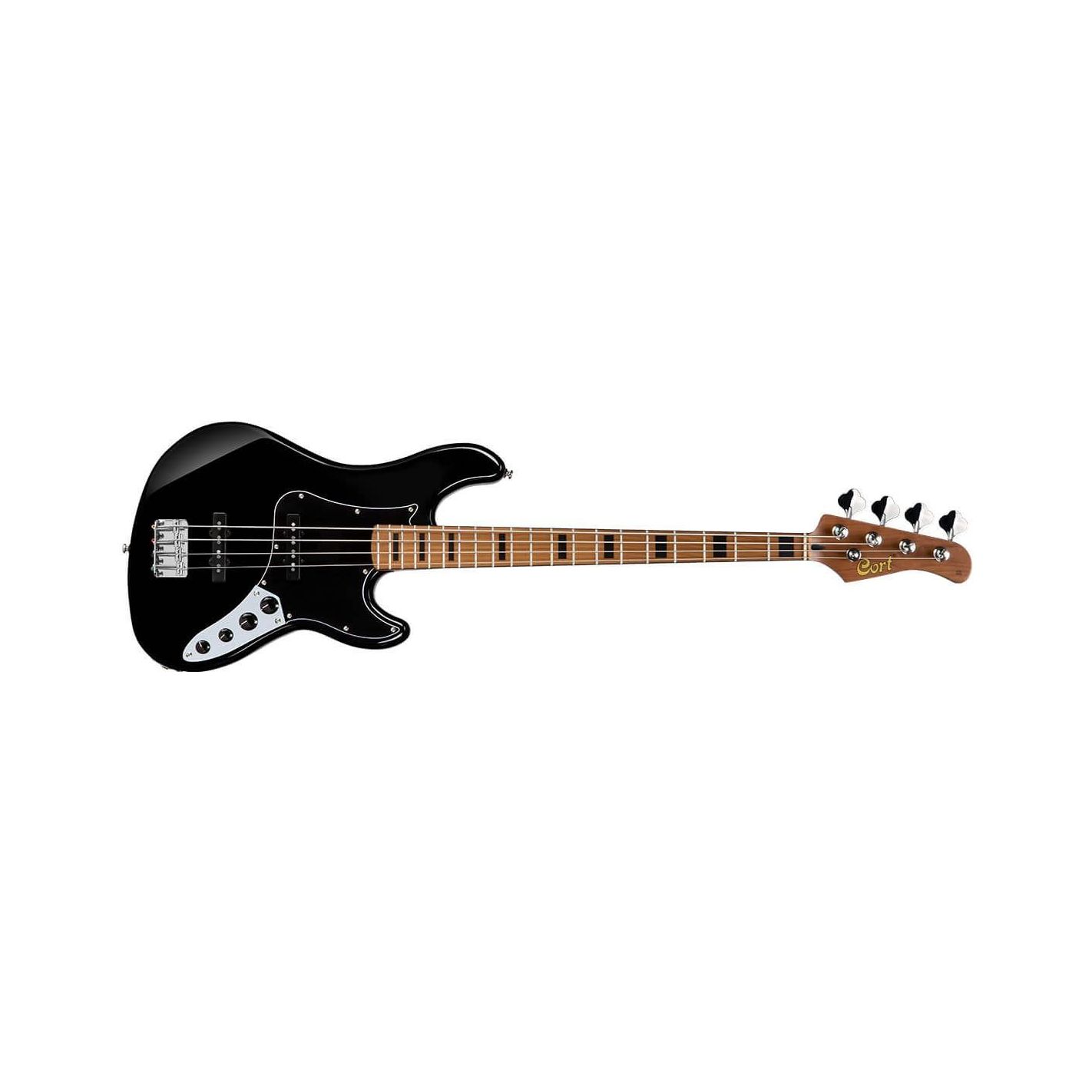 Bajo eléctrico Cort GB64JJ - Construcción bolt-on, cuerpo de arce blando, escala de 34" (864 mm). Mástil de arce tostado con diapasón de arce duro tostado, radio 9.45" (R240), 20 trastes con incrustaciones tipo bloque negro y cejuela de 38 mm. Pastillas Cort Voiced Tone VTB-ST con electrónica activa/pasiva: volumen, balance y ecualizador de 2 bandas con push-pull. Puente vintage y clavijeros open gear. Herrajes en cromo, cuerdas D’Addario EXL165.