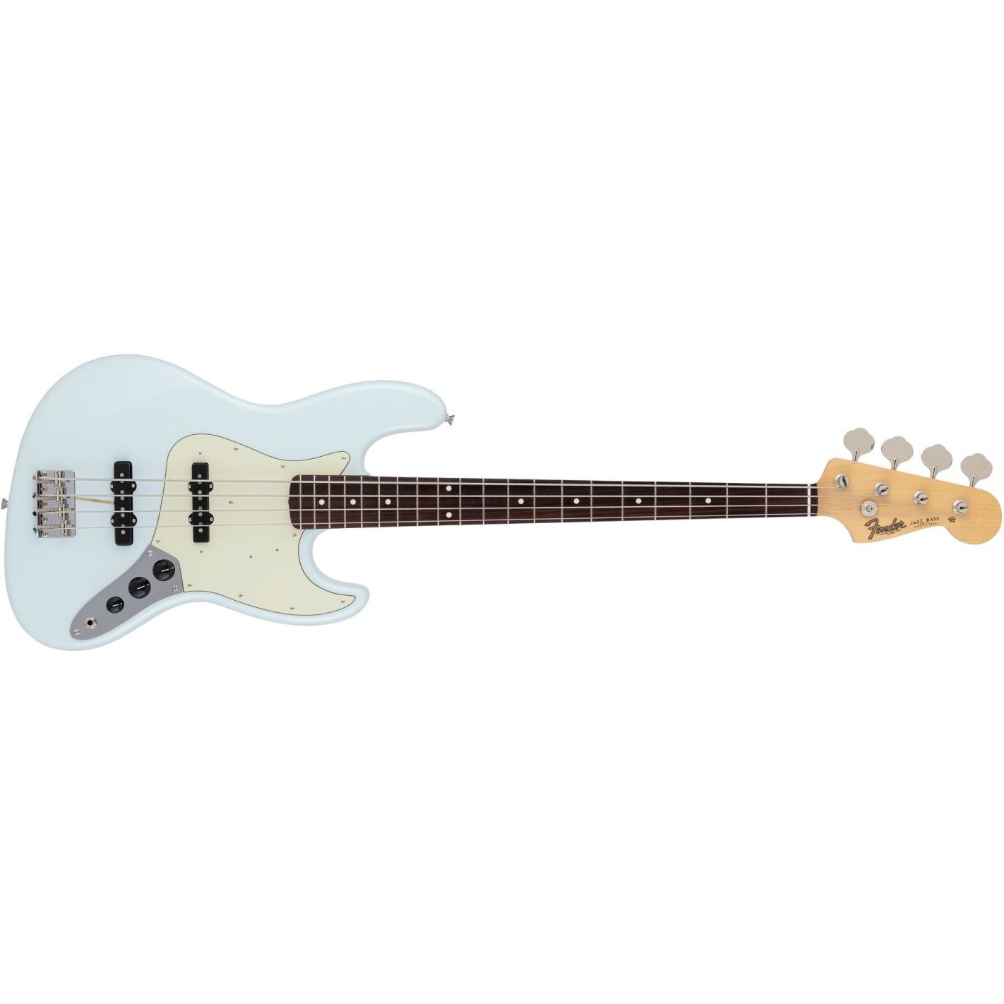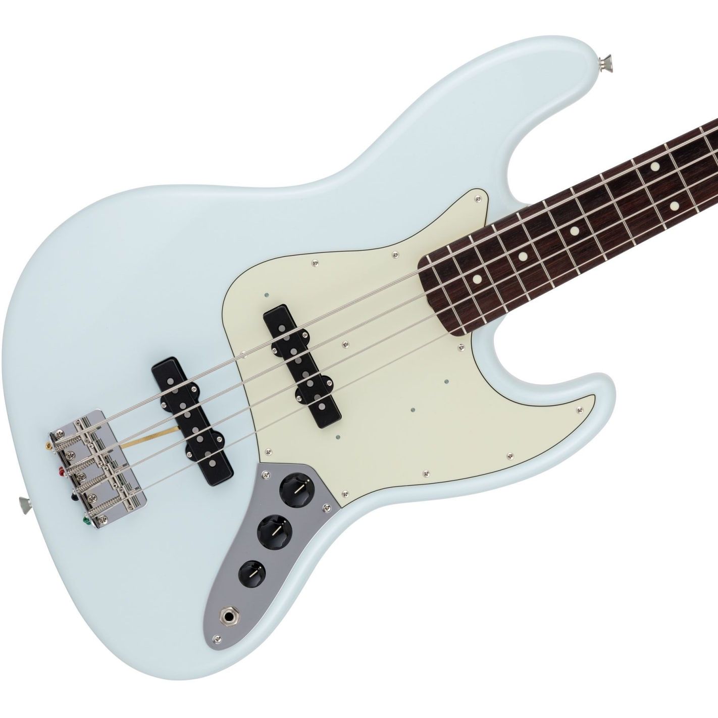 Bajo eléctrico Fender Made in Japan Traditional 60s Jazz Bass, Rosewood Fingerboard, Sonic Blue - Cuerpo de tilo con acabado en poliéster brillante y forma Jazz Bass. Mástil de arce con acabado en uretano brillante, perfil en “U” y diapasón de palisandro con radio de 9.5" (241 mm), 20 trastes vintage e incrustaciones tipo “dot” blancas. Escala larga de 34" (864 mm), cejuela de hueso de 38 mm. Pastillas Vintage-Style Single-Coil Jazz Bass (mástil y puente), configuración SS. Controles: volumen mástil, volumen puente y master tone. Puente vintage de 4 selletas. Clavijeros vintage. Hardware niquelado/cromado. Golpeador verde menta de 3 capas. Incluye gig bag.