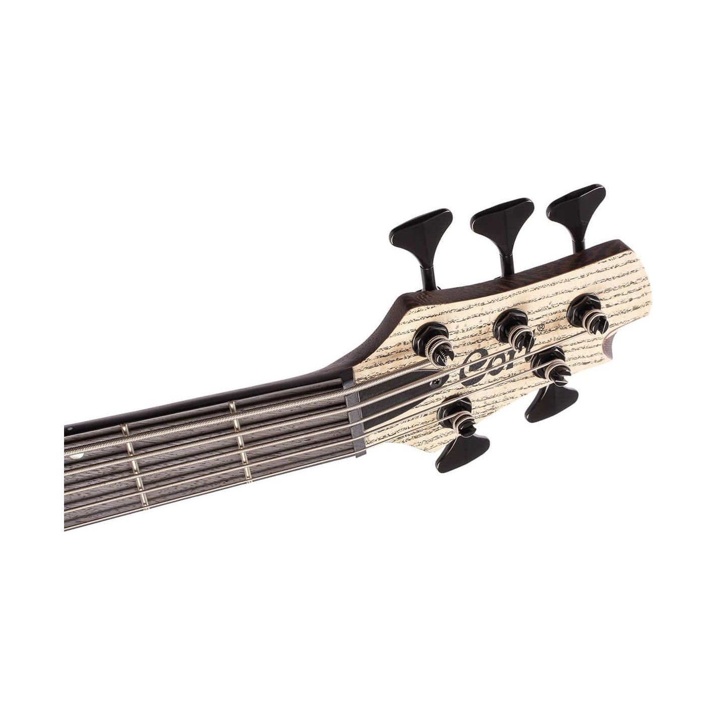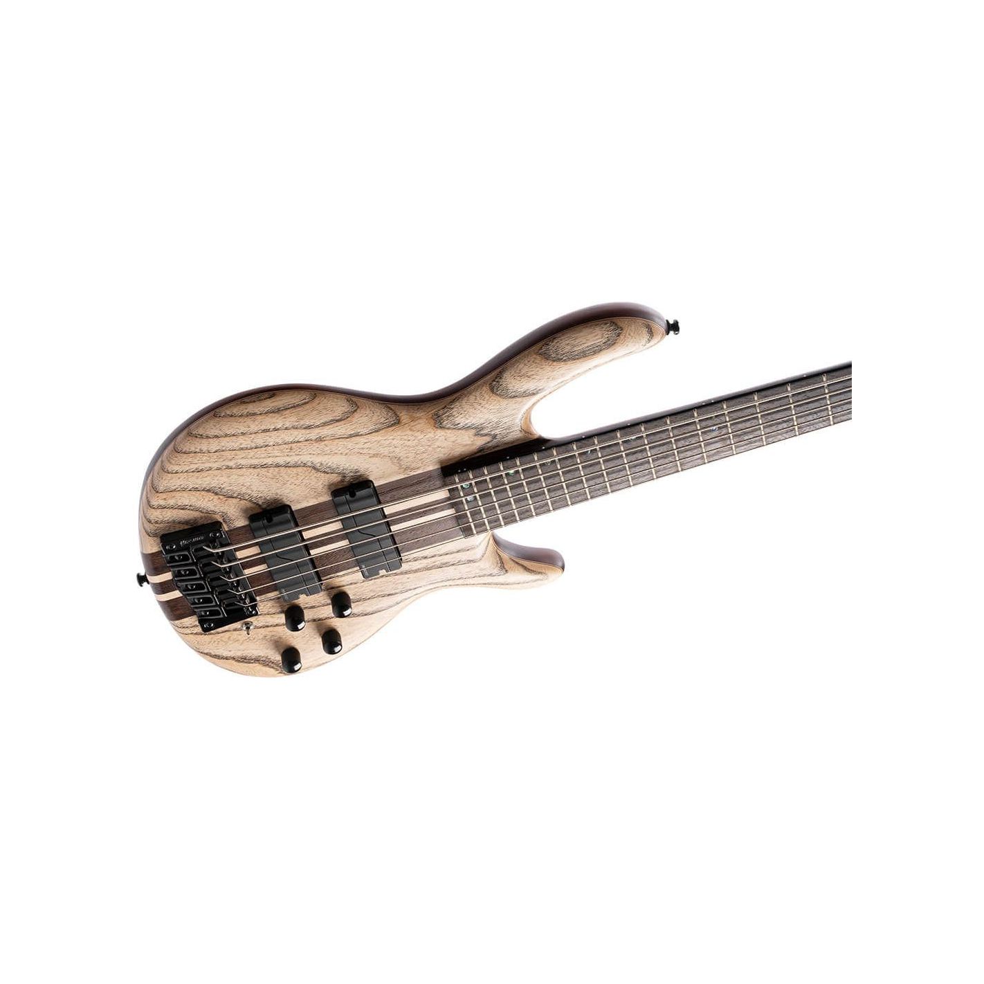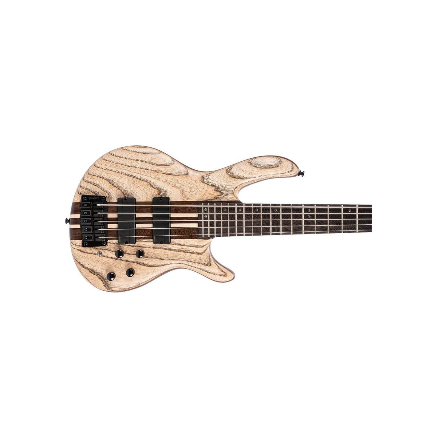 Bajo eléctrico Cort A5 Ultra Ash ENB - Construcción neck-thru con cuerpo de caoba y tapa de fresno blanco 9T, acabado mate poro abierto Etched Natural Black. Mástil laminado de 5 piezas (arce y panga panga) con perfil en C, grosor de 20,5 mm (1er traste) y 22 mm (12º traste). Diapasón de panga panga con ribete negro, radio de 15,75" (R400), 24 trastes medium-jumbo de níquel-plata e incrustaciones de puntos de abulón con marcadores laterales blancos. Escala de 34" (864 mm), cejuela PPS negra de 45 mm. Pastillas Fishman Fluence Soapbar (5 cuerdas) con ecualizador activo de 2 bandas. Controles: