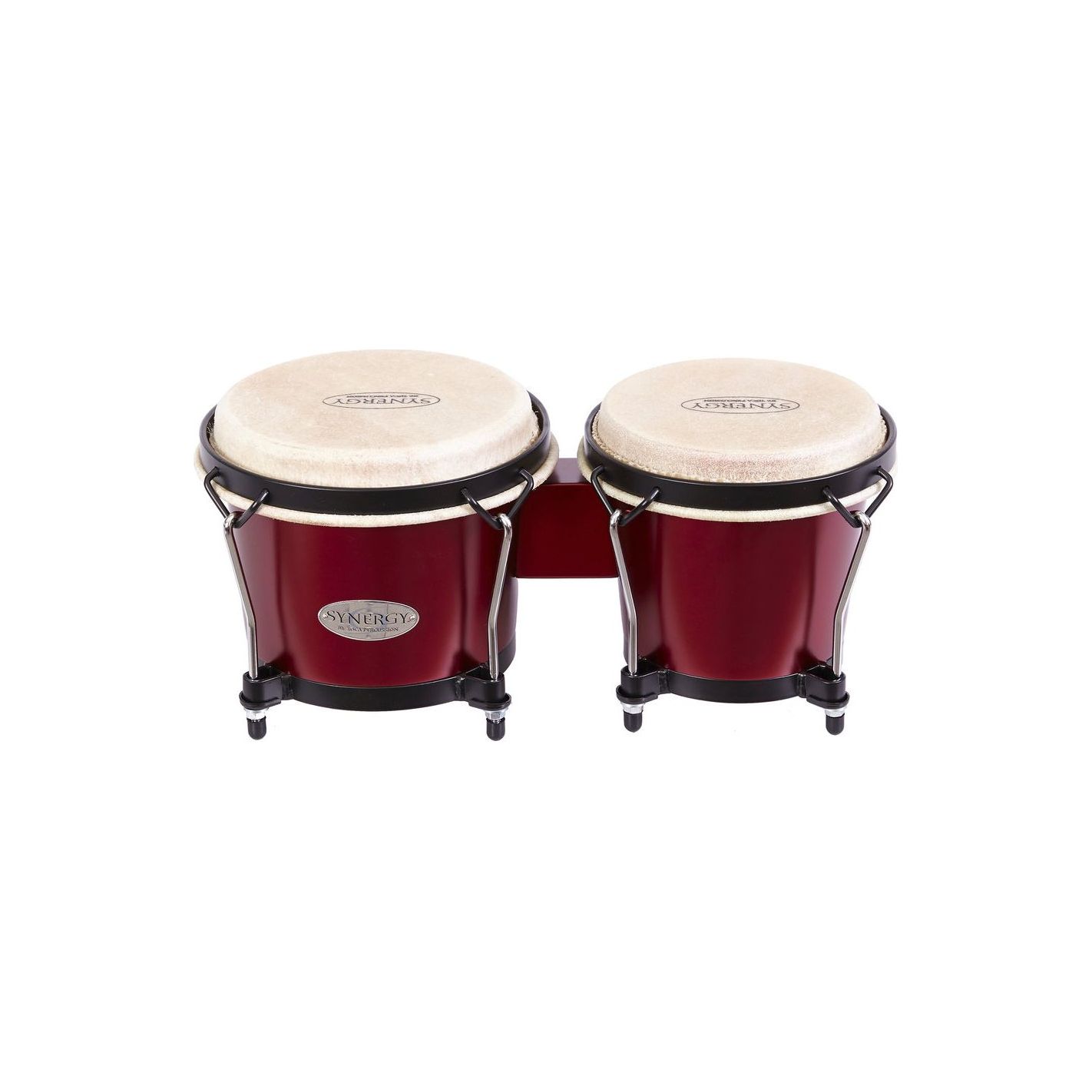 Bongo Synergy Wood Toca 2100RRD, Matte Racing Red - Bongó de 6" y 7" con casco de roble asiático y parches de piel natural. Aros tradicionales, herrajes con recubrimiento negro en polvo y ganchos de tensión cromados.