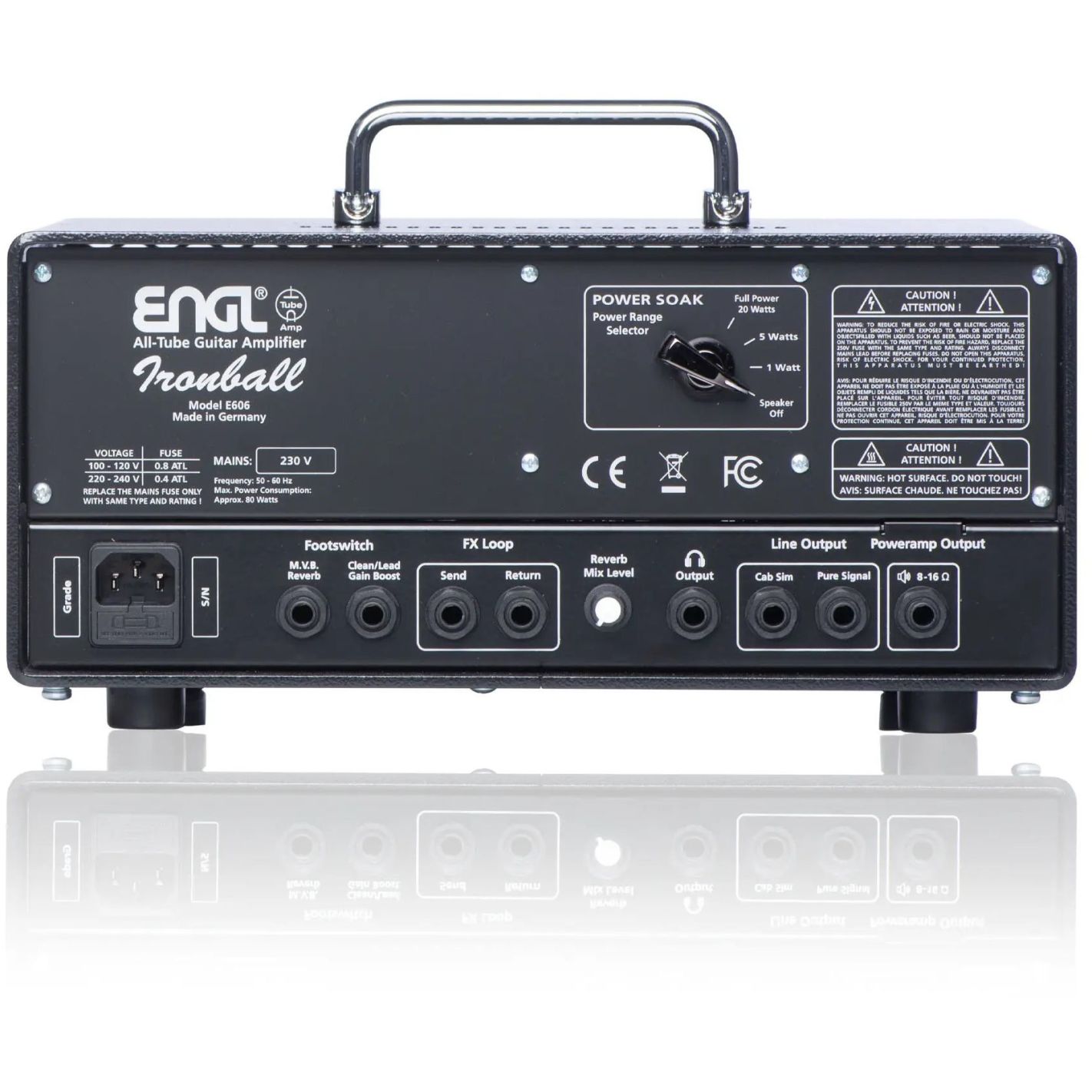 Cabezal de guitarra eléctrica a válvulas Ironball - E 606 - 20W (2xEL84) - 2 canales - Gain de canales Clean y Lead independiente - Lead Volumen para balancear el volumen entre canales - Master Volumen - Master Volumen Boost en la parte posterior del panel - Sección de ecualización de 3 bandas de frecuencia compartida - Presence - Reverb con control y activación via Midi - Gain boost accionable en panel frontal o por pedalera - Loop efectos en serie - Line out compensada con simulador altavoz - 2 x Entrada jack estéreo para conexión del Custom Footswitch Z-4 (no incluido) - Atenuador de potencia en panel posterior (20W, 5W, 1W, Cero power para grabación) - Salida para altavoces a 8 y 16 ohm - Salida auriculares