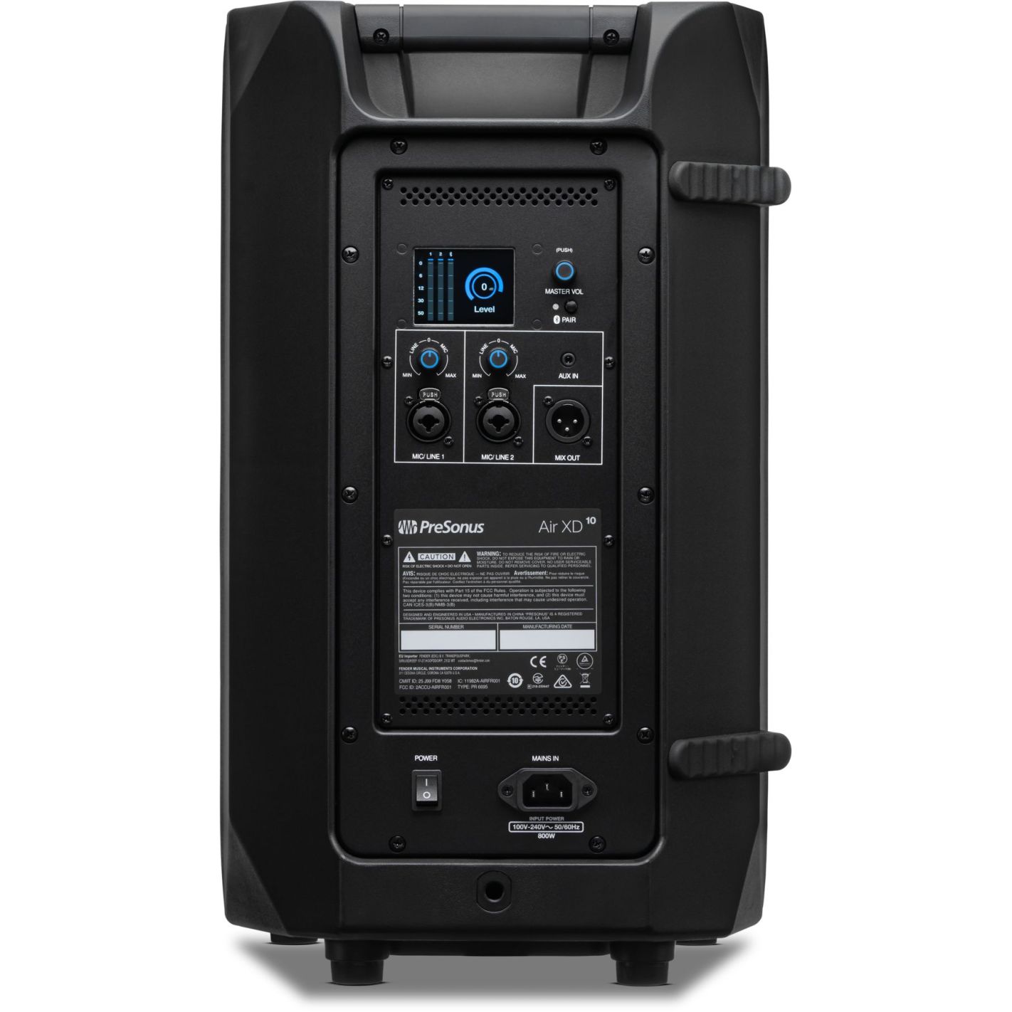 Altavoz activo PreSonus AIR XD 10 - Caja acústica profesional full-range con driver LF de 10” y bobina de 2,36” para respuesta extendida hasta 55 Hz, junto a driver HF de 1” con diafragma PEEK para agudos claros y duraderos. Amplificación biamplificada Clase D de 1500 W con SPL máximo de 130 dB. DSP integrado con presets, ecualización ±10 dB y modos de ajuste para voz, música, FOH o monitor. Pantalla LCD a color de 2,6” para control y medición. Bluetooth con modo TWS Bridge para enlace estéreo inalámbrico. Mezclador de 3 canales con entradas combo mic/line y auxiliar. Cobertura 90° x 60°. Diseño robusto y portátil con opciones de montaje en mástil, apilado, colgado o uso como monitor de suelo.