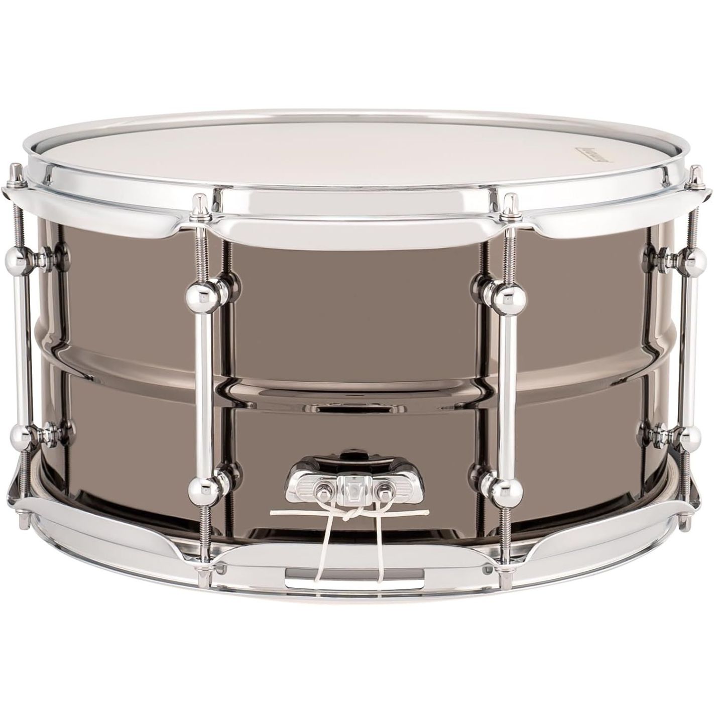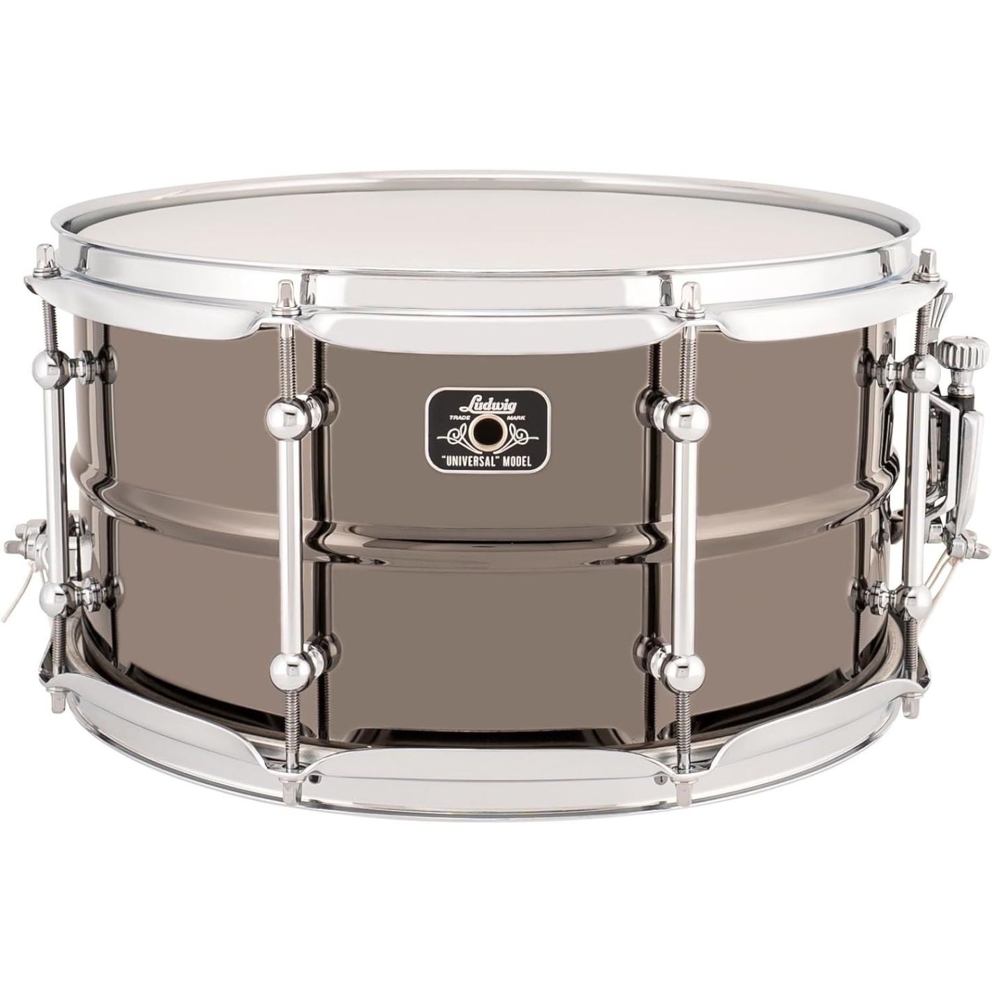 Caja Ludwig LU0713CDIR Universal Brass, Black Nickel - Serie Universal Metal, casco de latón, medida 13x7", bellotas tipo tubo de alta resistencia, aros Triple Flanged, 8 divisiones de afinación, sistema bordonero P88I, cierre de bordón P35, bordón de 20 hilos, herrajes con acabado cromado.