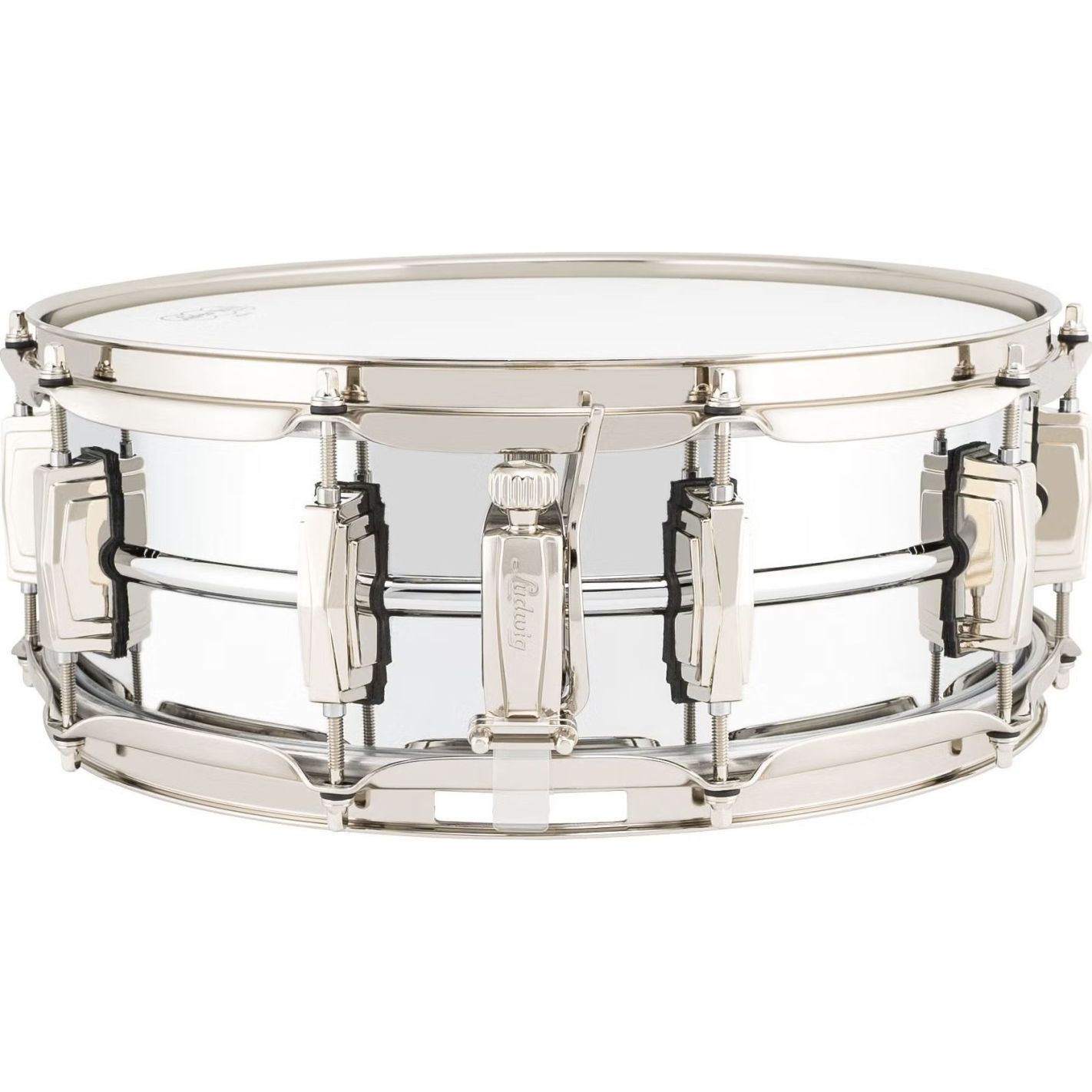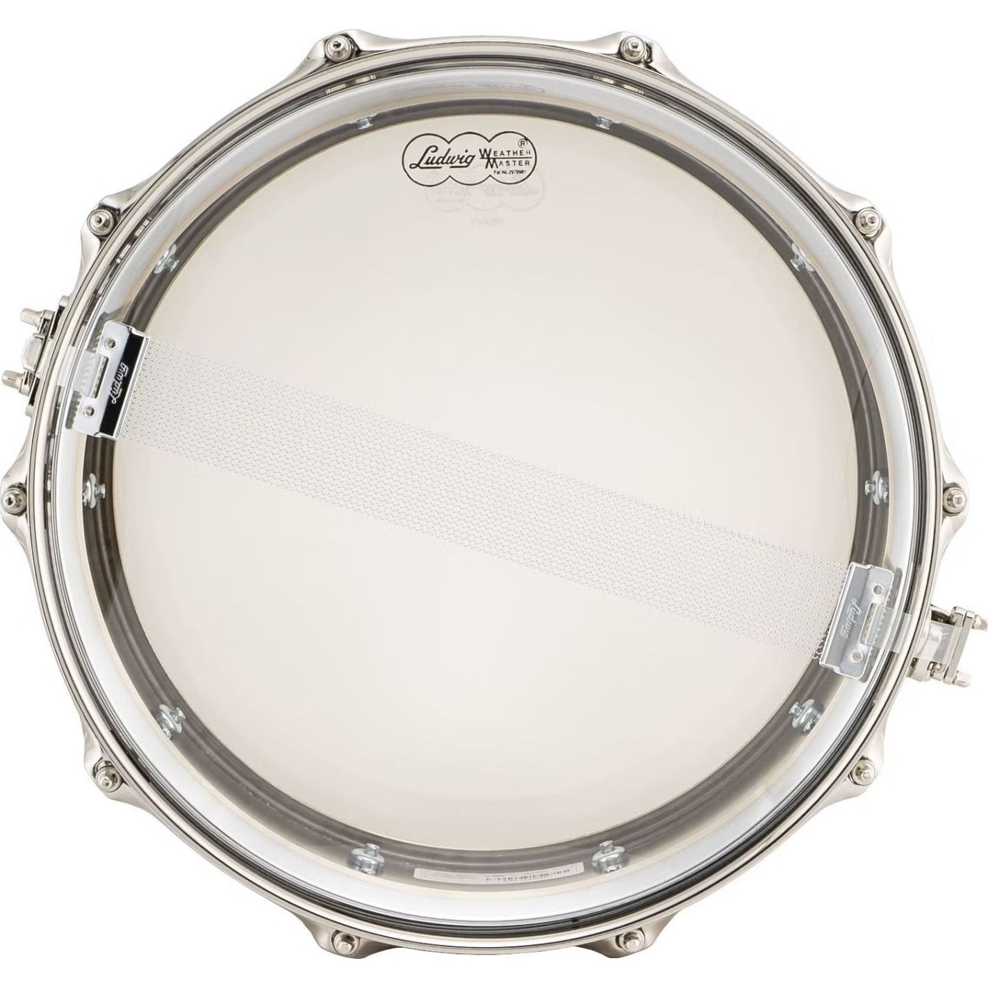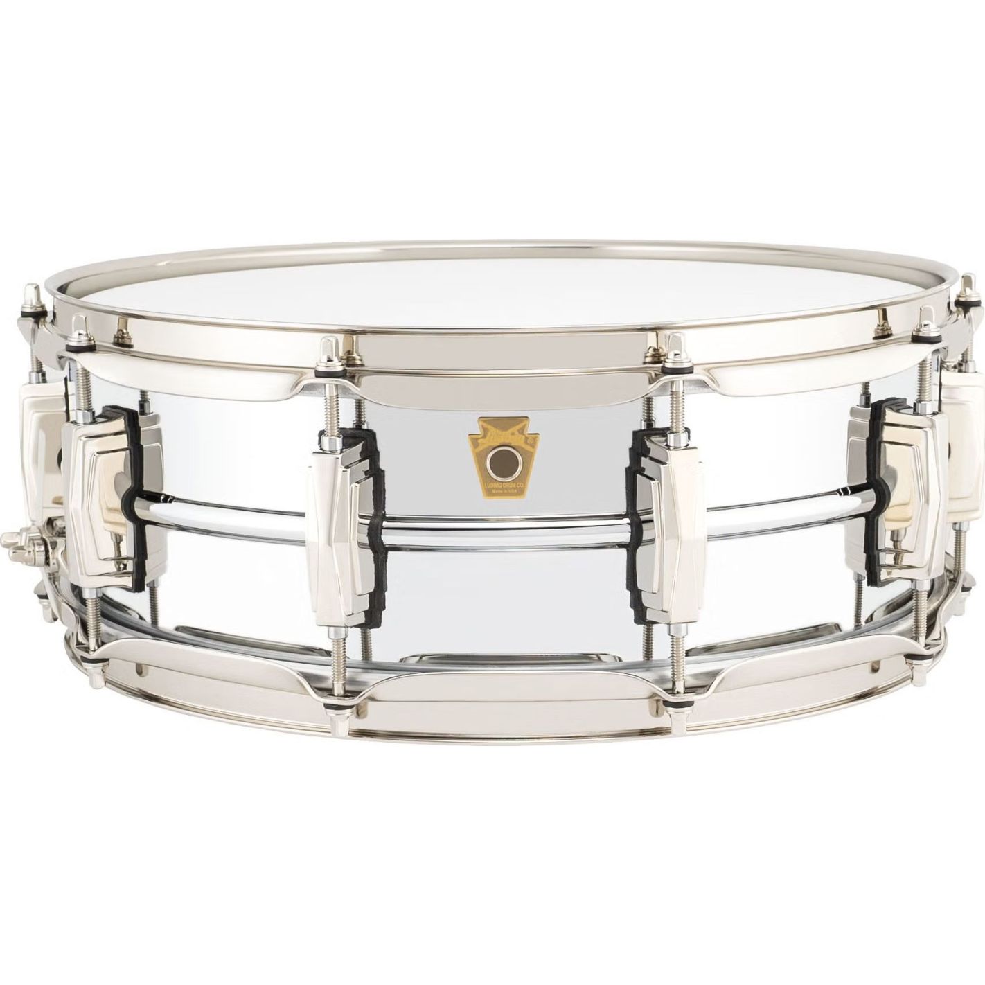 Caja Ludwig LB400BN Super Chrome Over Brass 14x5, w/ Nickel Hardware - Casco de latón cromado sin costuras, diámetro 14", profundidad 5", herrajes niquelados, sistema bordonero P88 con butt-end P35, insignia inspirada en la clásica Transition.