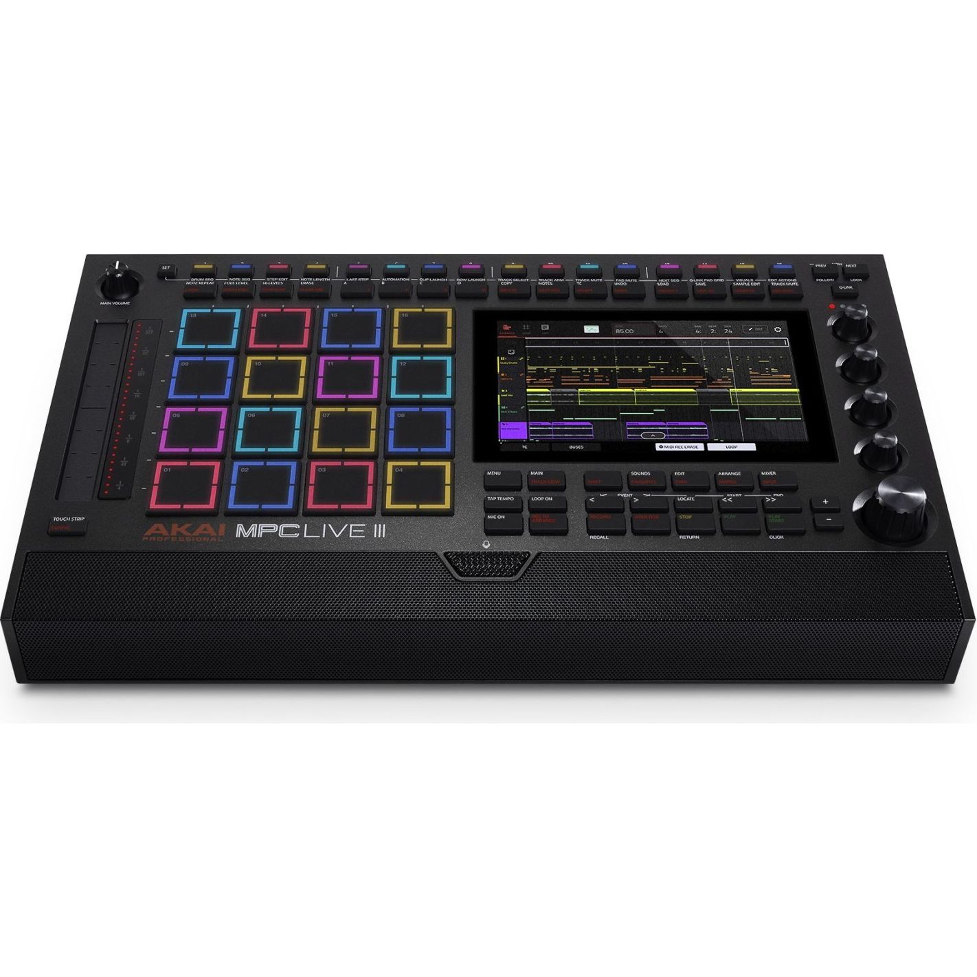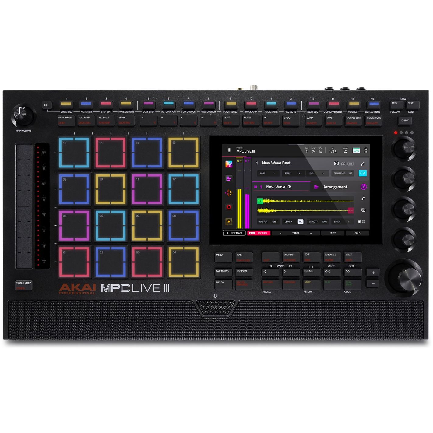 Centro de producción musical autónomo, Akai Professional MPC Live III - Pantalla multitáctil de 7", pads MPCe con detección 3D sensibles a velocidad y presión, secuenciador por pasos de 16 botones RGB, tira táctil de interpretación, sistema operativo MPC3 OS con flujo de trabajo ampliado y nuevas funciones (Clip Matrix, Pro Stems Separation, Utility Plug, EQ, Pro Reverb), procesador ARM de 8 núcleos con 8 GB de RAM, almacenamiento interno de 128 GB ampliable por SSD o tarjeta SD, interfaz de audio integrada de 24 bits/96 kHz, hasta 24 canales de E/S vía USB-C, 2 entradas combo XLR/TRS, entradas RCA phono, 6 salidas TRS, 8 salidas CV/Gate, MIDI I/O, Wi-Fi, Bluetooth, batería recargable con autonomía de hasta 4 horas, micrófono de condensador y monitores estéreo integrados.
