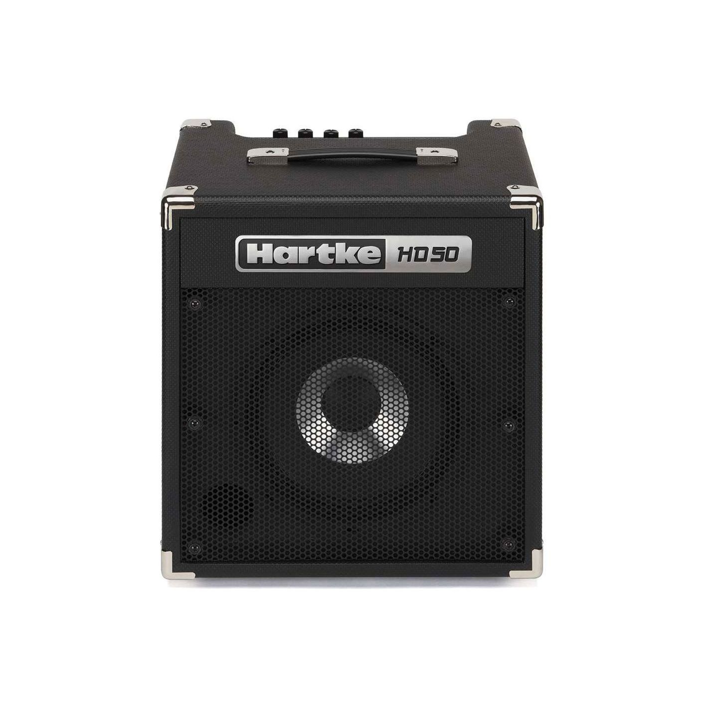 Combo de bajo Hartke HD50 - Potencia de 50 W, altavoz 1x10" con cono Hydrive de papel y aluminio e imán cerámico, entrada para bajos activos y pasivos, ecualizador de 3 bandas, limitador integrado, entrada auxiliar CD/MP3, salida de auriculares, rejilla metálica y asa superior.