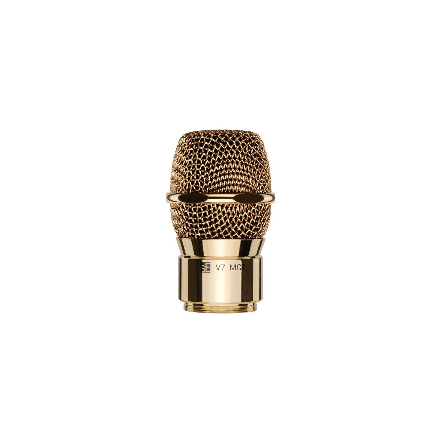 Cápsula de micrófono, SE Electronics V7 Mc2 Gold - Cápsula dinámica supercardioide DMC7 compatible con sistemas inalámbricos Sennheiser. Ofrece un sonido nítido y natural con gran rechazo a la retroalimentación y excelente aislamiento de la voz. Bobina de voz de aluminio, imanes de neodimio y soporte antivibratorio patentado para bajo ruido de manejo. Construcción metálica en aleación de zinc con rejilla de acero inoxidable anticorrosión y acabado dorado brillante. Incluye funda, protector roscado, paravientos amarillo y pegatina SE. Dimensiones: 54 x 86,5 mm; peso: 145 g.