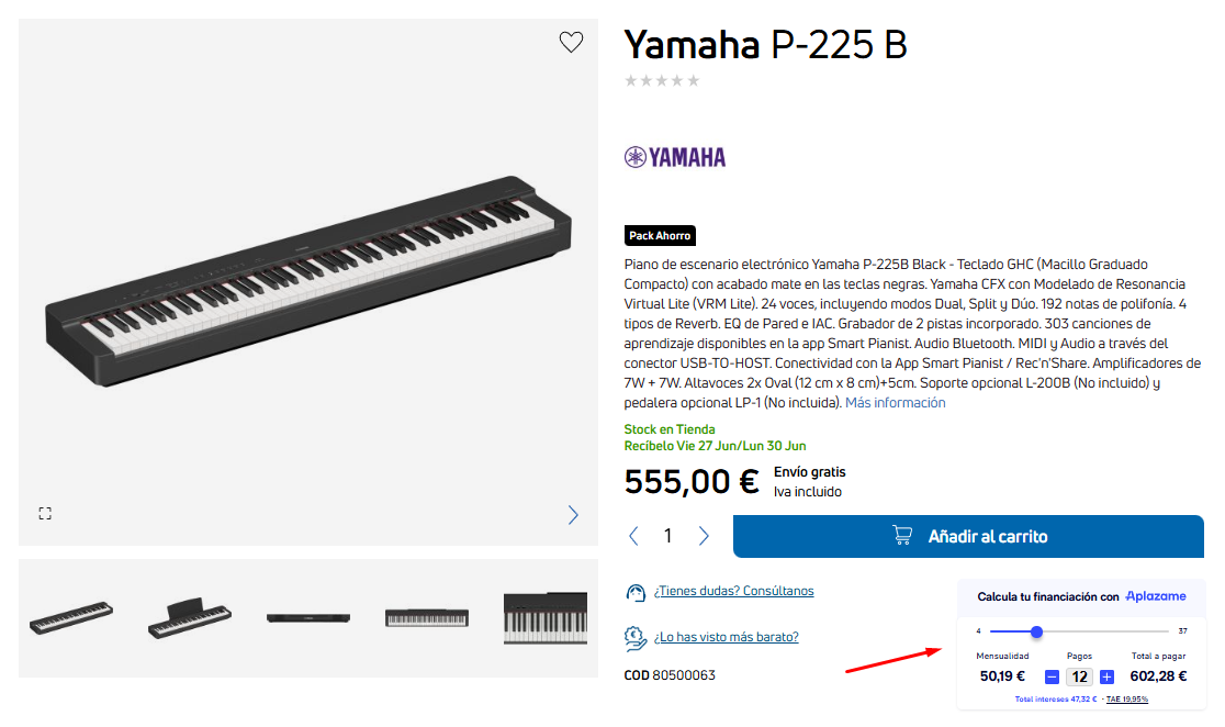 Si eliges financiar tu compra de 555€ en 12 plazos, verás el pago inicial y las cuotas mensuales junto con el total que pagarás al final, incluyendo los intereses.