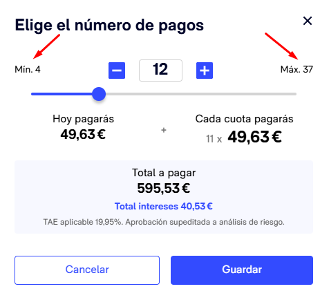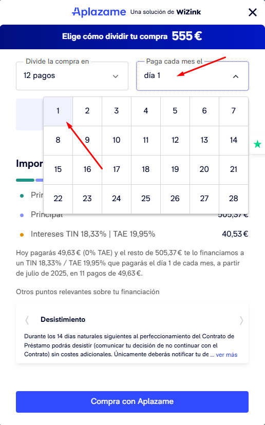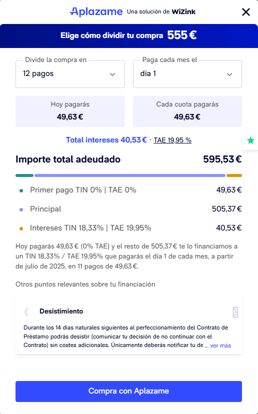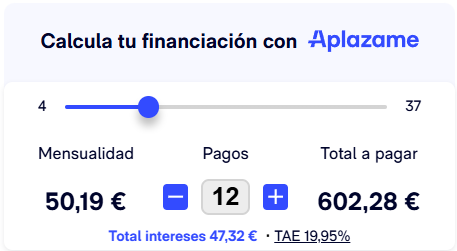 Configura tu Plan de Financiación: Una vez seleccionado Aplazame, se te presentarán varias opciones de financiación. Podrás elegir el número de cuotas y ver el pago inicial, el importe de cada cuota mensual y el total a pagar con intereses incluidos. Por ejemplo: