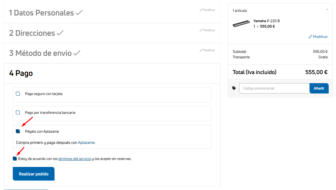 Finaliza tu Pedido: Una vez aceptados los términos y realizado el pago inicial (si aplica), simplemente haz clic en "Realizar pedido" para completar la transacción.
