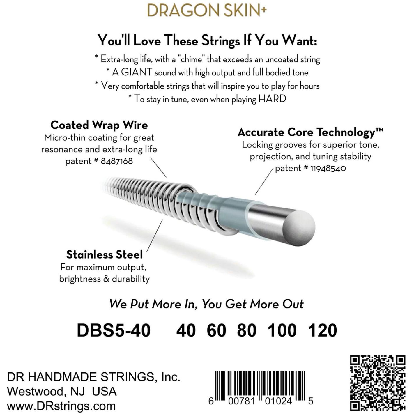 Juego De 5 Cuerdas Para Bajo Bass Guitar 5-String Set. Dragon Skin+. Coated Stainless Steel Bass Strings. 5 String Light 40-120: 40, 60, 80, 100, 120. Light. Round Core Wire with Accurate Core Technology on a Ball End with a Clear Coated Stainless Steel Wrap Wire.