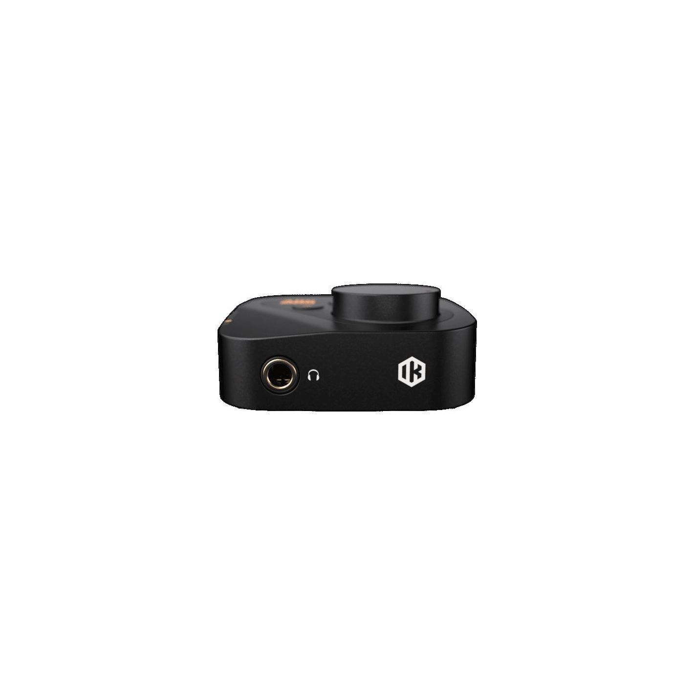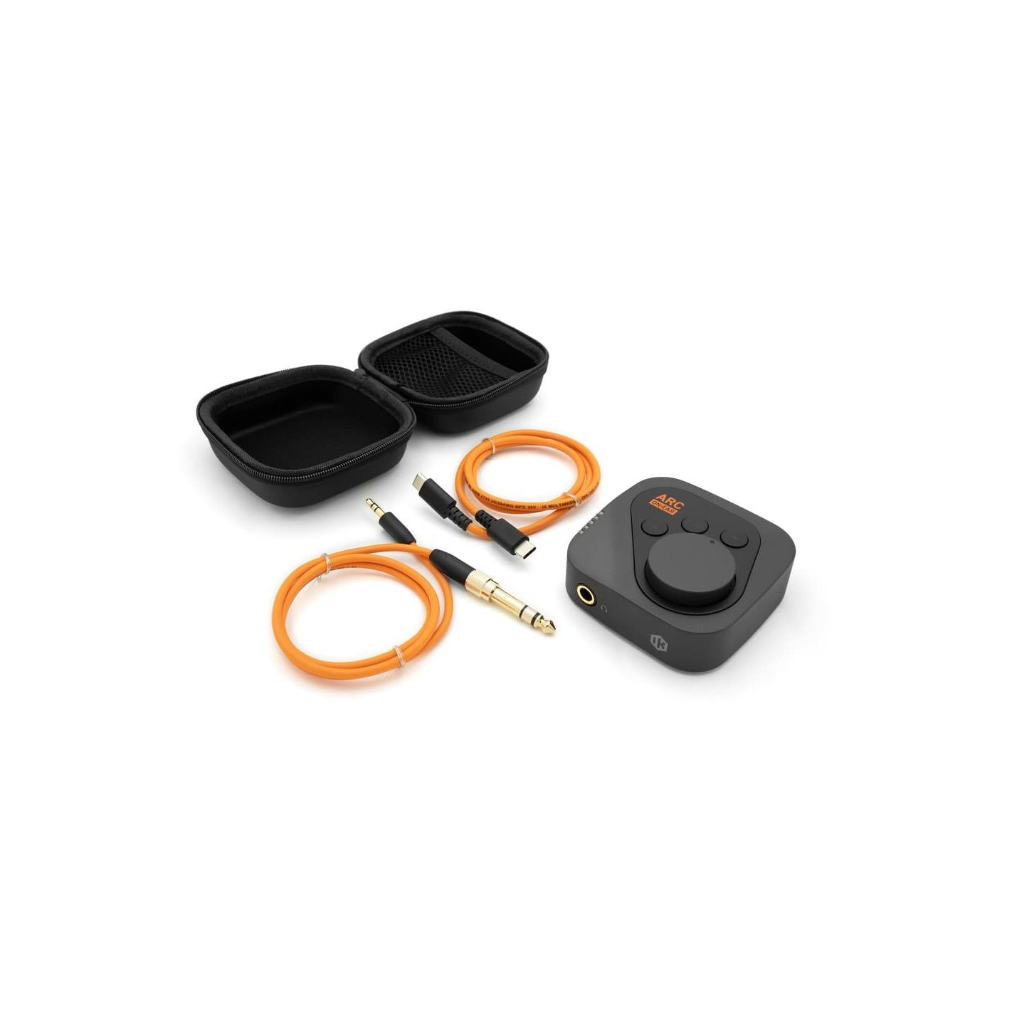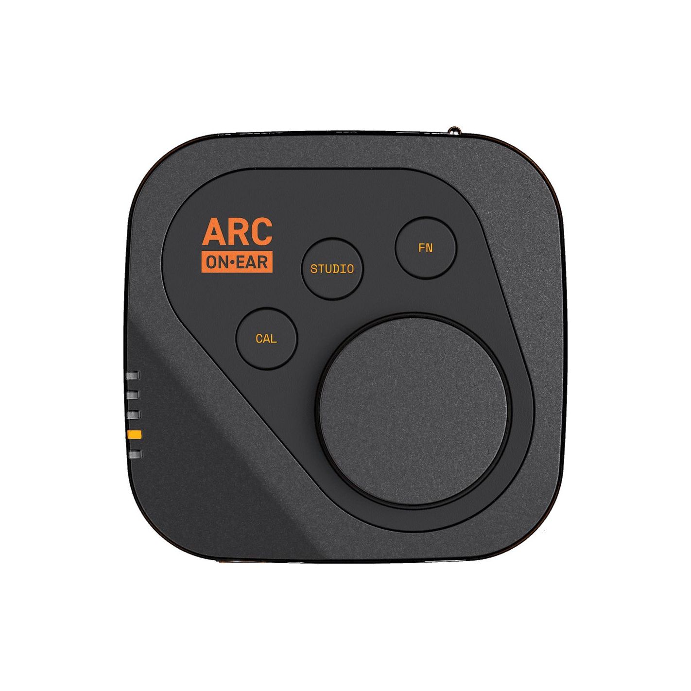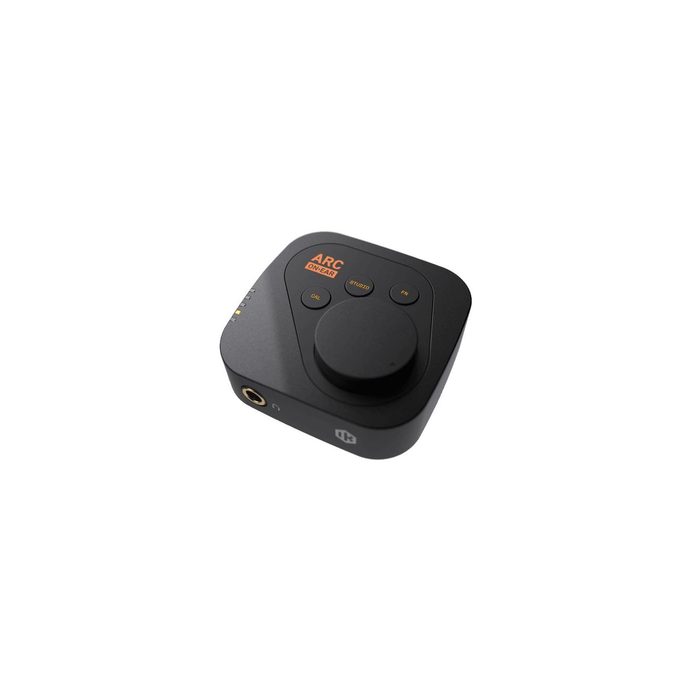 Convertidor y amplificador de auriculares Ik Multimedia Arc On-Ear - Dispositivo portátil de calidad de estudio con calibración de auriculares y simulación de estudio integradas, sin necesidad de software adicional. Basado en perfiles medidos de más de 250 modelos, ajusta la respuesta en frecuencia y ofrece imagen estéreo realista mediante algoritmo de crossfeed. Incorpora DAC ES9290 (116 dB), amplificador de 200 mW y control de volumen analógico digital. Hasta 5 preajustes almacenables, batería recargable (4 h), conexiones USB-C, jack 3,5 mm y salida 6,3 mm. Incluye funda, cables TRS y