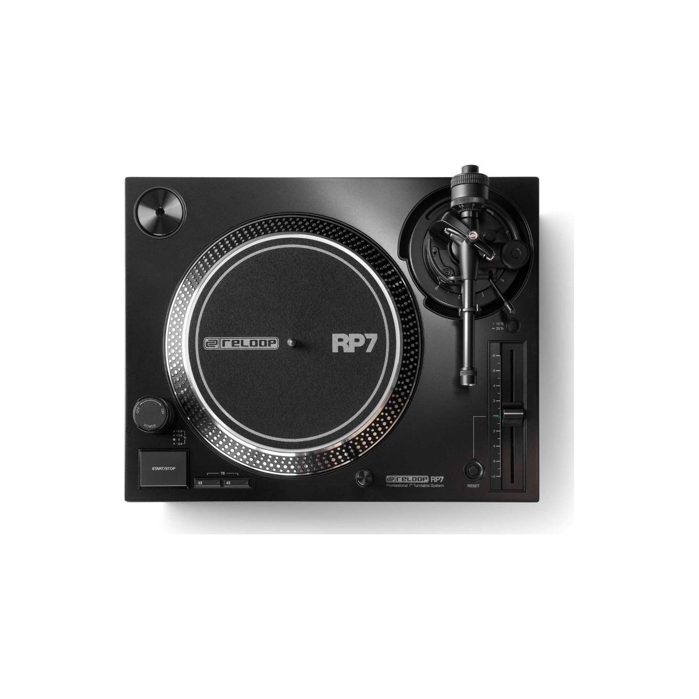 Reloop Rp-7 - Plato Giradiscos Reloop Rp7: el primer sistema profesional de tocadiscos de 7'' para Dj del sector, fabricado en serie y desarrollado para aquellos que valoran el encanto único de los 45 rpm. Con su elegante diseño, que combina un alto par motor y un brazo fonocaptor de probada eficacia, el Rp7 ofrece un rendimiento profesional tanto para uso Dj como para disfrutar del vinilo. Como homenaje a la cultura de los 45 rpm, el Reloop Rp7 captura el encanto único de este querido formato y rinde tributo a aquellos que consideran los vinilos de 7 pulgadas como algo más que un simple