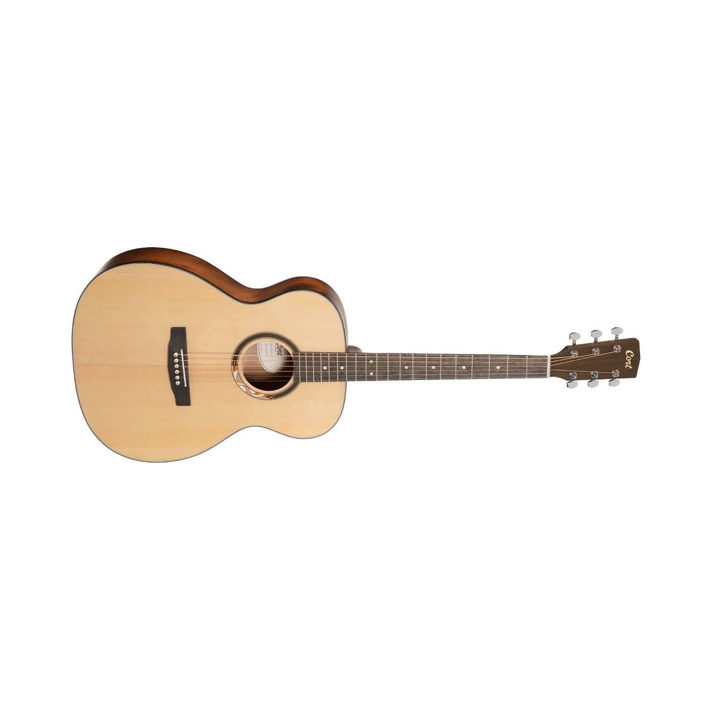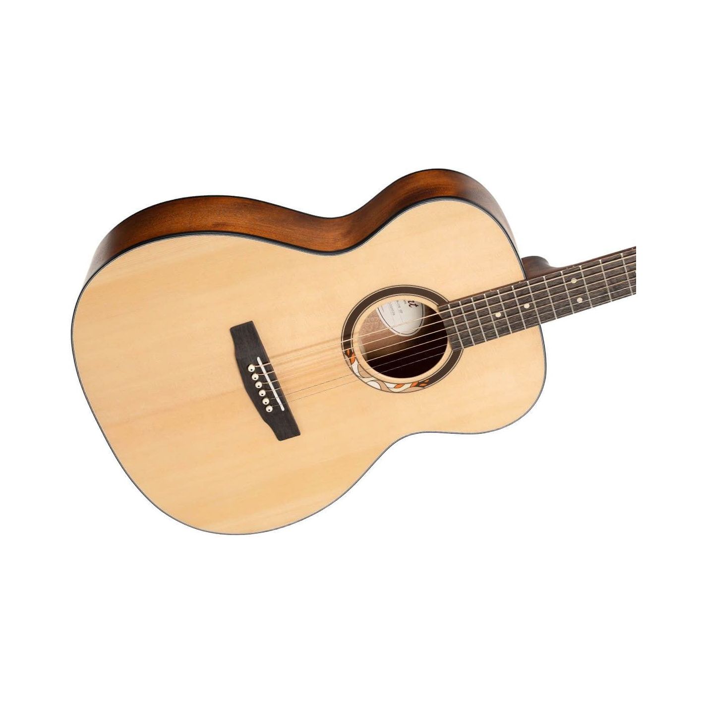 Guitarra acústica Cort Arium, Open Pore (OP) W-Bag - Cuerpo tipo OM con tapa de abeto Sitka y aros y fondo de caoba, ensamblado con unión tipo dovetail y varetaje Advanced X-Bracing. Ribetes en negro y boca de 95 mm con roseta Amber Flow. Mástil de caoba en forma C con tacón triangular y alma de doble acción. Diapasón de laurel con radio de 15.75" (400 mm), 20 trastes e incrustaciones tipo punto. Escala de 25.5" (648 mm), cejuela PPS de 43 mm. Puente de laurel con pins envejecidos en blanco con punto negro. Clavijeros die-cast. Acabado natural Open Pore.