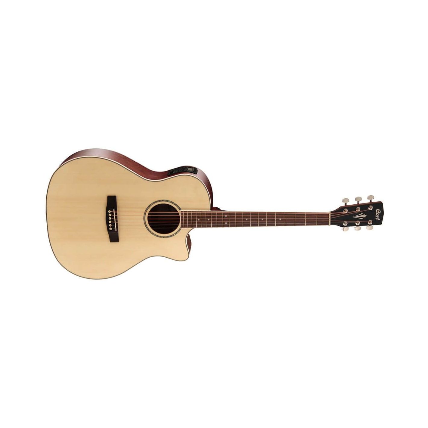 Guitarra acústico-eléctrica Cort Grand Regal GA-MEDX M OP - Cuerpo de caoba con forma Grand Auditorium y corte veneciano, unión mástil-cuerpo tipo dovetail y varetaje Advanced X-Bracing. Tapa, aros y fondo de caoba. Mástil de caoba con perfil en C y alma de doble acción. Diapasón de laurel con radio de 15.75" (R400), incrustaciones tipo punto y 20 trastes. Escala de 25.5" (648 mm), cejuela PPS de 45 mm. Puente de laurel con pins envejecidos en blanco con punto negro y selleta PPS. Electrónica Cort CE306T. Roseta múltiple de abalone y ribetes blancos. Clavijeros die-cast, cuerdas recubiertas.
