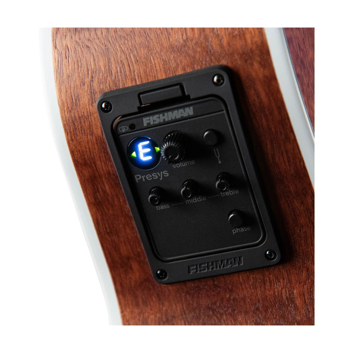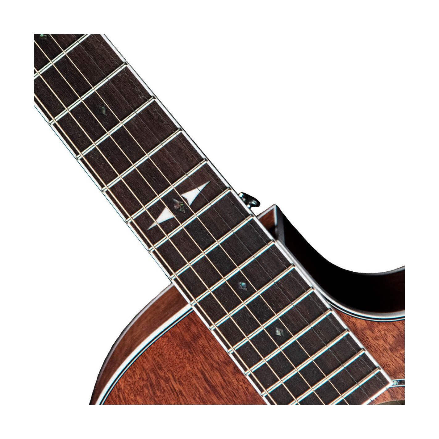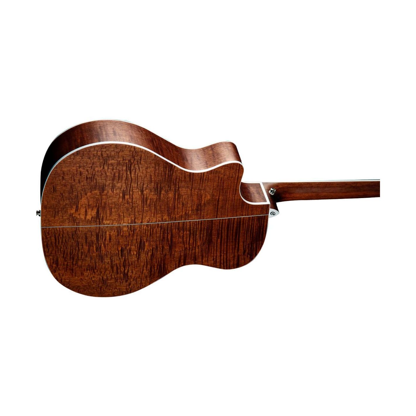 Guitarra acústica electrificada Cort Grand Regal GA5F-FMH - Cuerpo Grand Auditorium con cutaway venetian, tapa sólida de caoba flameada, aros y fondo de caoba flameada, varetaje en X scalloped avanzado. Mástil de caoba con perfil moderno en “V”, diapasón de ovangkol con radio de 15.75” (R400), incrustaciones de abalone, 20 trastes y cejuela de hueso de 45 mm. Puente de ovangkol con pins de ébano y selleta de hueso. Roseta múltiple de abalone, binding blanco envejecido y boca de 100 mm. Electrónica Fishman Presys. Clavijeros die-cast. Cuerdas D’Addario EXP16.
