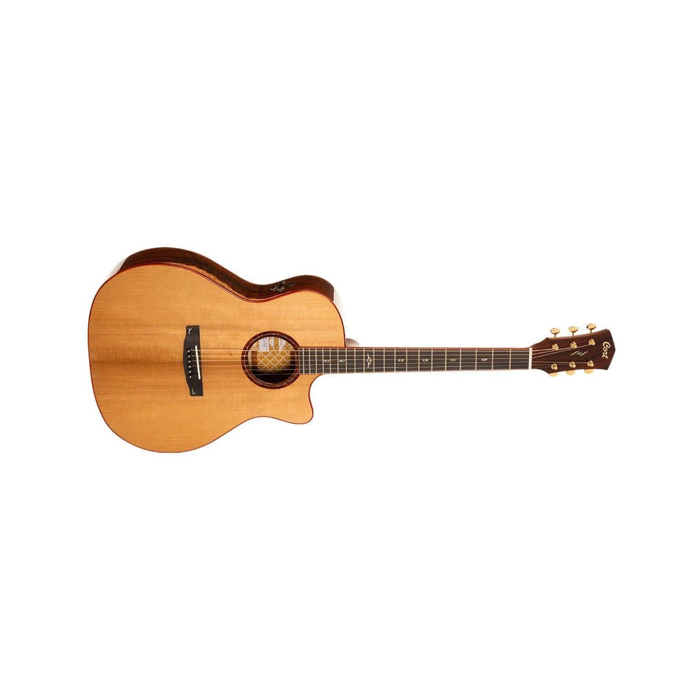 Guitarra electroacústica Cort Gold-A10 NAT W-Case - Cuerpo Grand Auditorium con cutaway veneciano, tapa maciza de abeto Adirondack tostado, fondo y aros de cocobolo macizo AAA, acabado brillante. Refuerzo en X recortado a mano. Mástil de caoba reforzada con nogal, unión en cola de milano al traste 14, perfil Comfort C y acabado satinado. Diapasón de ébano con radio de 15,75" (R400), 20 trastes e incrustaciones personalizadas doradas. Escala de 25,5" (648 mm), cejuela y selleta de hueso genuino de 44,5 mm. Puente y clavijas de ébano. Electrónica Fishman Flex Blend. Clavijeros Grover Gold Open Gear. Cuerdas Elixir Phosphor Bronze Nanoweb Light (12-53). Ribetes, tira trasera y detalles en padauk y arce. Incluye estuche.