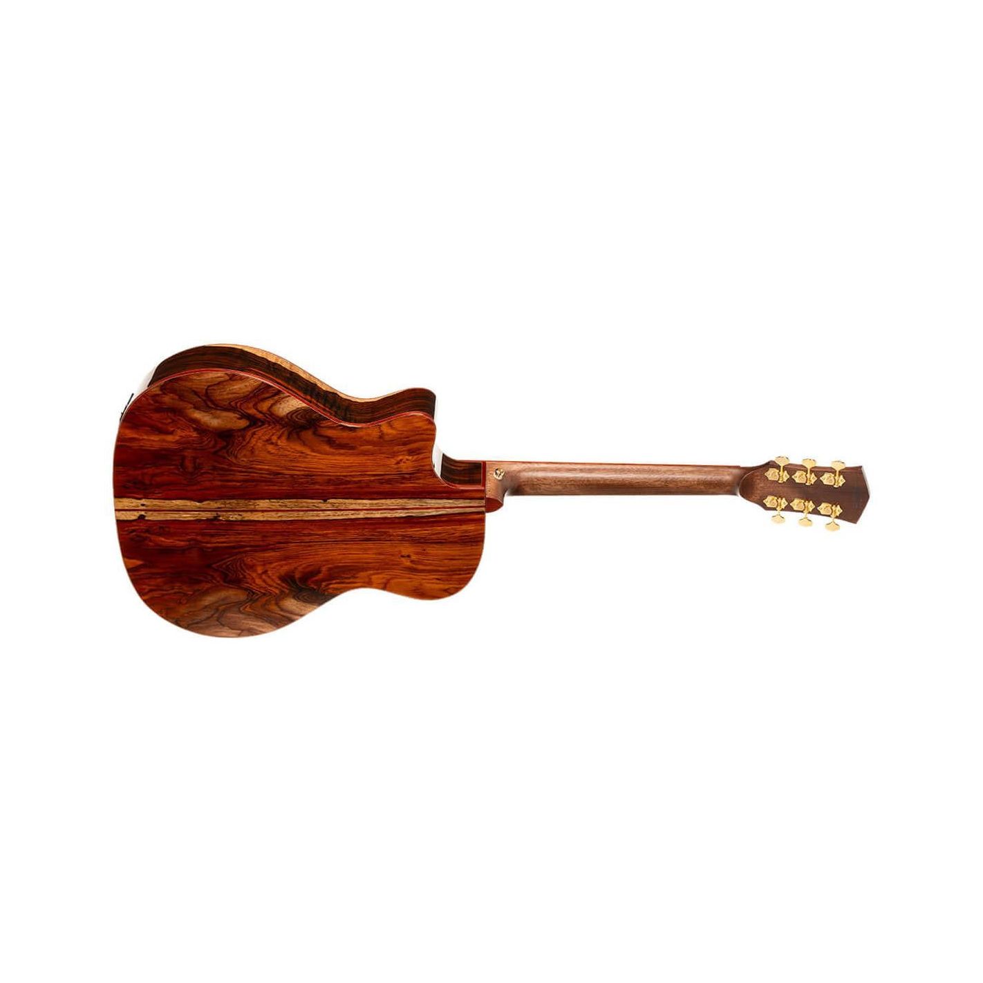 Guitarra electroacústica Cort Gold-A10 NAT W-Case - Cuerpo Grand Auditorium con cutaway veneciano, tapa maciza de abeto Adirondack tostado, fondo y aros de cocobolo macizo AAA, acabado brillante. Refuerzo en X recortado a mano. Mástil de caoba reforzada con nogal, unión en cola de milano al traste 14, perfil Comfort C y acabado satinado. Diapasón de ébano con radio de 15,75" (R400), 20 trastes e incrustaciones personalizadas doradas. Escala de 25,5" (648 mm), cejuela y selleta de hueso genuino de 44,5 mm. Puente y clavijas de ébano. Electrónica Fishman Flex Blend. Clavijeros Grover Gold Open