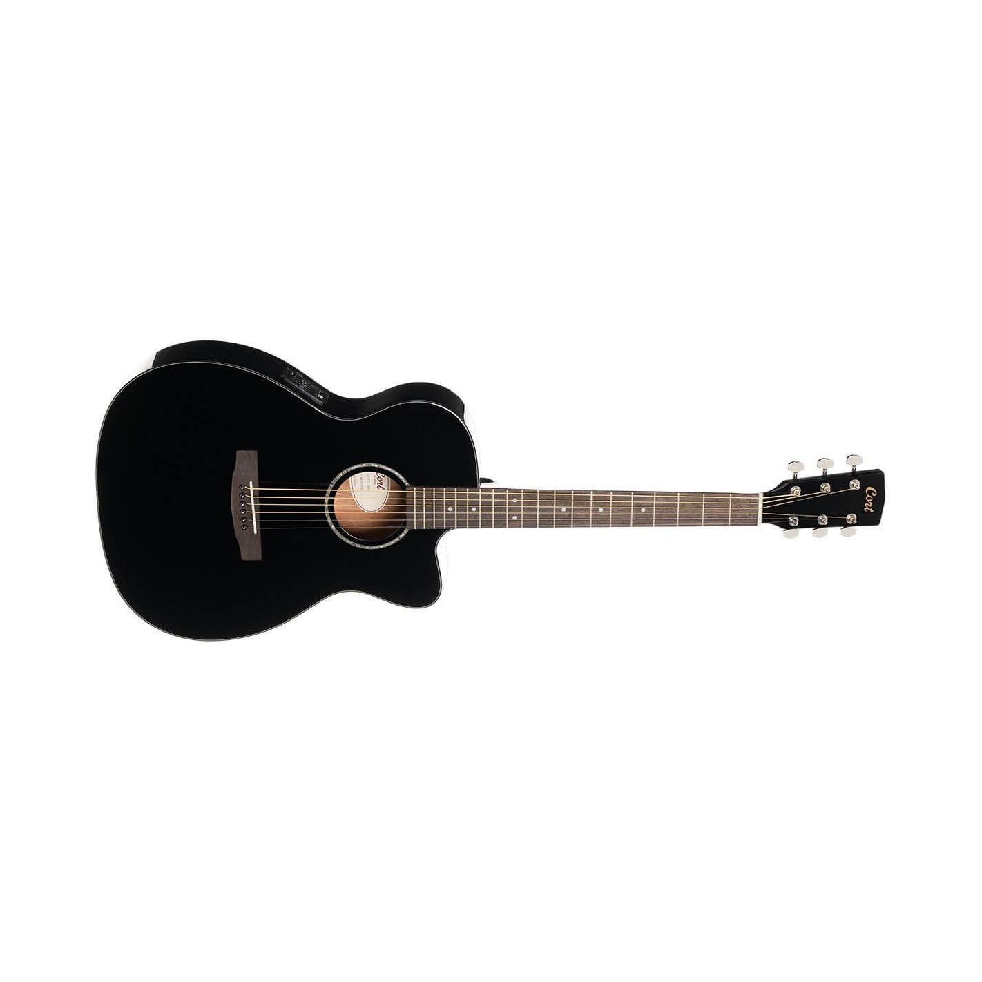 Guitarra electroacústica Cort L60CE, Black Gloss (BK) W-Bag - Cuerpo tipo OM con cutaway veneciano, tapa sólida de abeto y aros y fondo de caoba. Unión mástil-cuerpo tipo dovetail y varetaje en X avanzado. Mástil de caoba en forma C con grosor de 21.0 mm en el primer traste y 22.5 mm en el séptimo, talón triangular y alma de doble acción (llave de 4 mm). Diapasón de laurel con radio de 15.75" (R400), 20 trastes e incrustaciones tipo dot blancas de 6 mm. Escala de 25.5" (648 mm), cejuela de PPS de 43 mm. Puente de laurel con pines negros con punto blanco. Roseta de ABS y ribete negro. Boca de 82 mm. Clavijeros die-cast. Electrónica Cort CE304T con afinador integrado. Cuerdas coated. Acabado brillante negro.