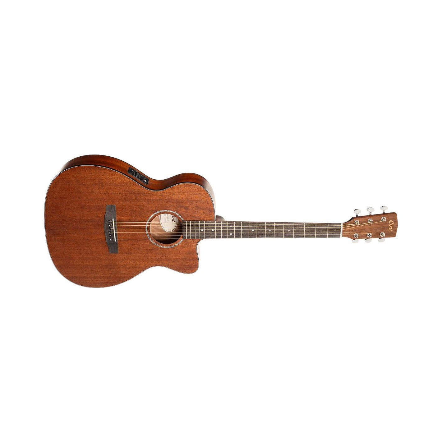 Guitarra electroacústica Cort L60MCE OP - Cuerpo tipo OM Cutaway veneciano con tapa maciza de caoba y fondo y aros de caoba. Construcción con unión del mástil en cola de milano y varetaje avanzado en X. Mástil de caoba en forma C con grosor de 21 mm (1er traste) y 22,5 mm (7º traste). Diapasón de laurel con radio de 15,75" (R400), 20 trastes e incrustaciones de puntos blancos de 6 mm. Escala de 25,5" (648 mm), cejuela PPS de 43 mm. Puente de laurel con pins negros y punto blanco. Electrónica Cort CE304T. Clavijeros de fundición. Roseta ABS, ribetes negros y orificio de sonido de 82 mm. Acabado Open Pore.