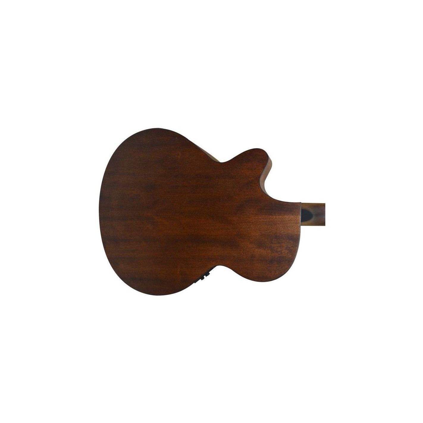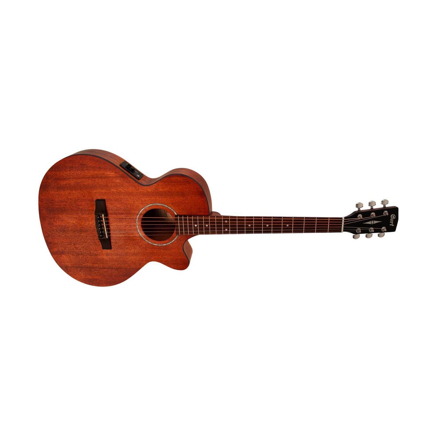 Guitarra acústica electrificada Cort SFX-MEM OP - Cuerpo SFX de profundidad slim con cutaway venetian, tapa, aros y fondo de caoba, varetaje en X avanzado. Mástil de caoba en forma “C” con diapasón de laurel, radio de 15.75” (R400), 20 trastes y cejuela PPS de 43 mm. Puente de laurel con pins negros con punto blanco y selleta PPS. Roseta White Acryl Pearl, binding negro y boca de 95 mm. Electrónica Cort CE304T. Clavijeros die-cast y cuerdas coated. Incluye funda