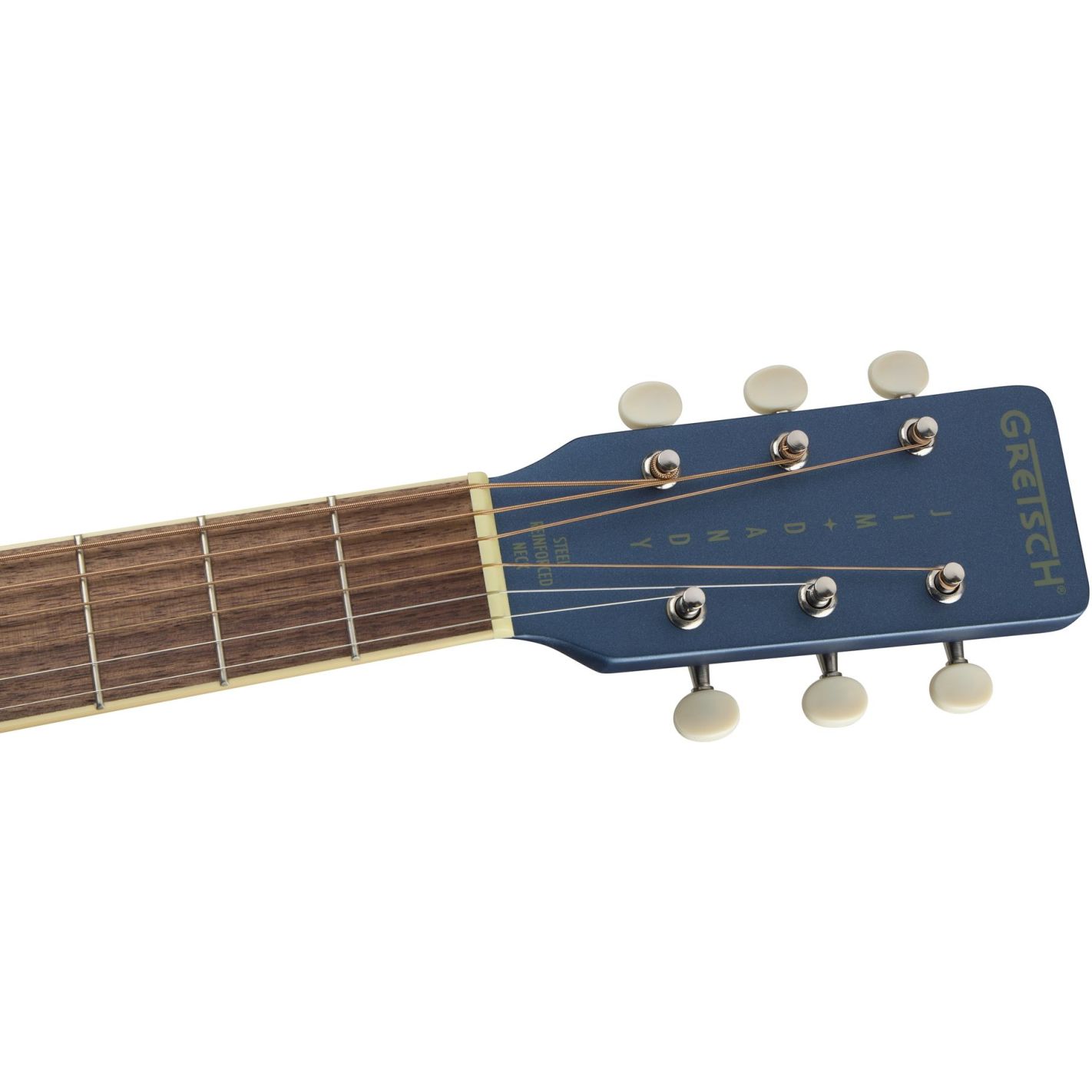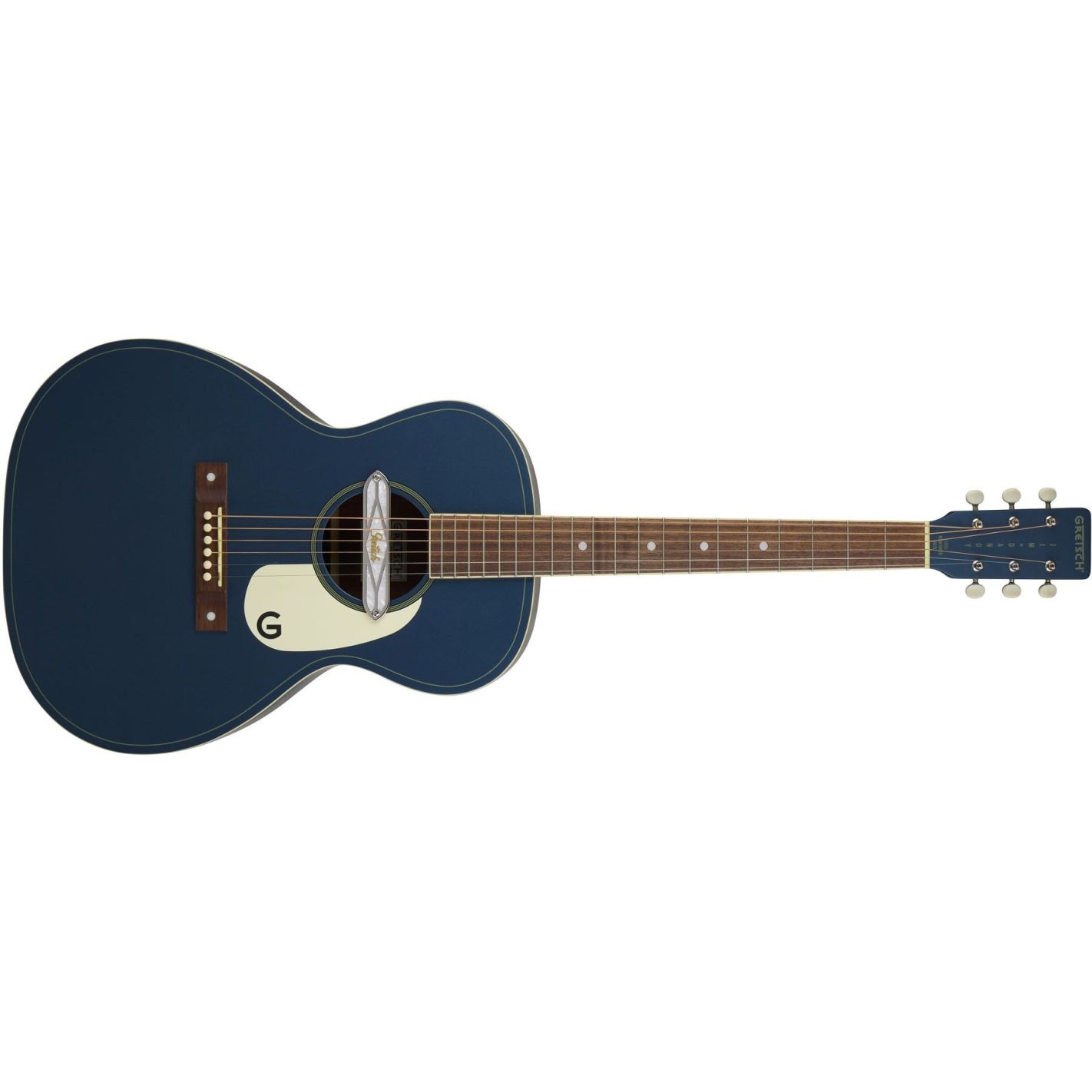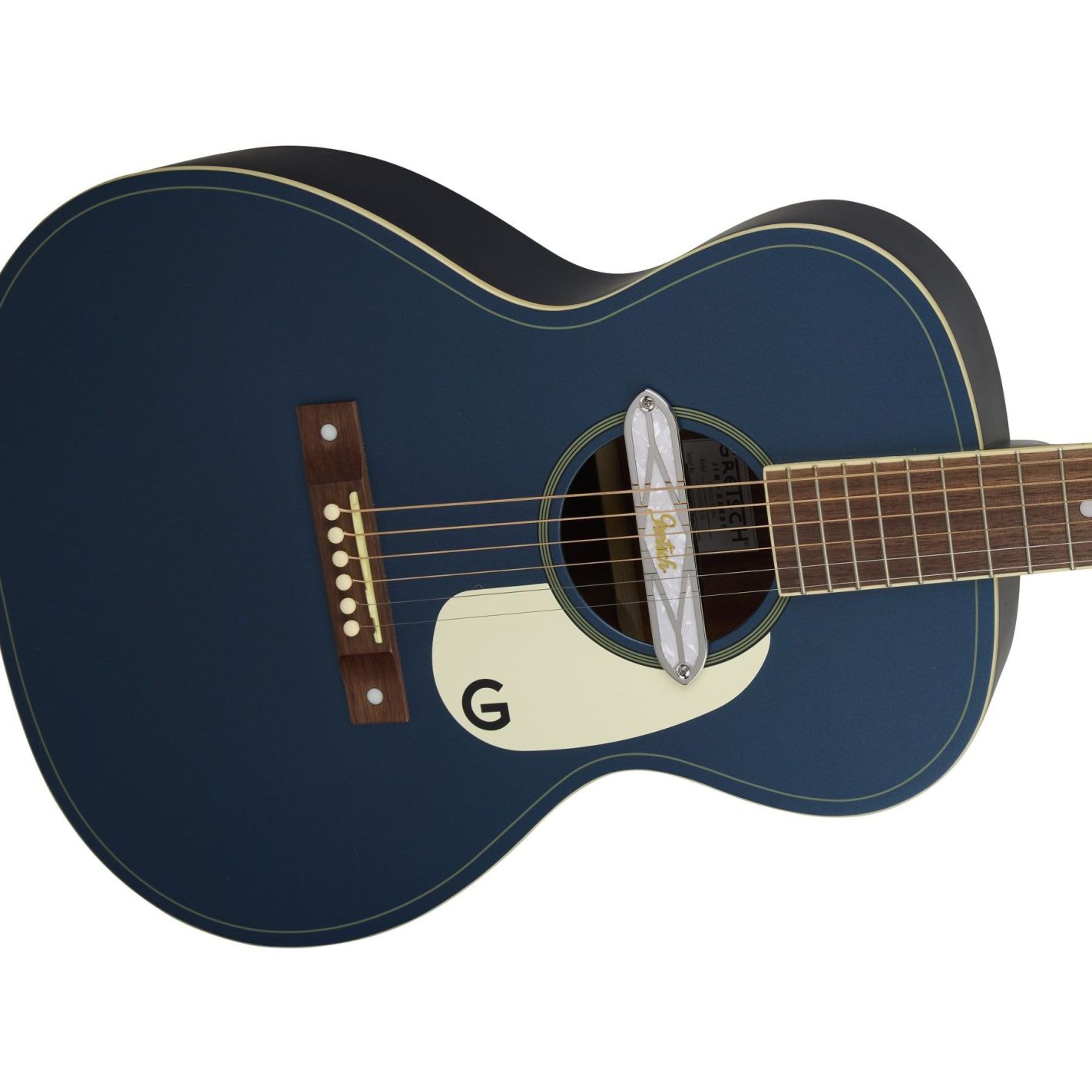 Guitarra acústica Gretsch Deltoluxe Concert, Walnut Fingerboard, Aged White Pickguard, Dark Denim Top - Cuerpo tipo concert de sapele laminado ligero con varetaje en X, acabado semibrillo Dark Denim y golpeador blanco envejecido de una capa con gráfico “G”. Mástil de nato en forma C con acabado semibrillo. Diapasón de nogal con radio de 12" (305 mm), incrustaciones tipo dot en pearloid blanco y 20 trastes vintag. Escala de 24.75" (629 mm), cejuela de hueso sintético de 42,86 mm. Puente de nogal estilo vintage con selleta compensada y pins fijos. Clavijeros abiertos estilo años 50 3x3 en fundición a presión. Pastilla magnética Gretsch Deltoluxe en boca. Acabado del hardware niquelado.