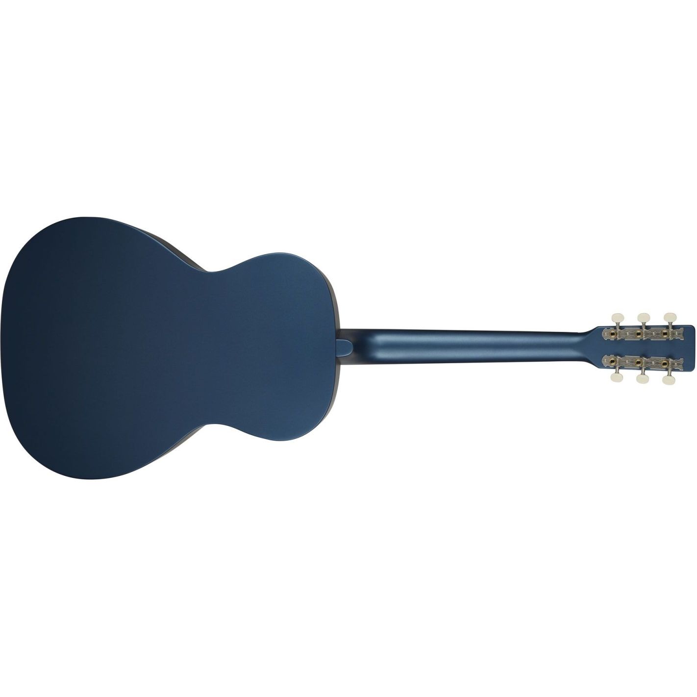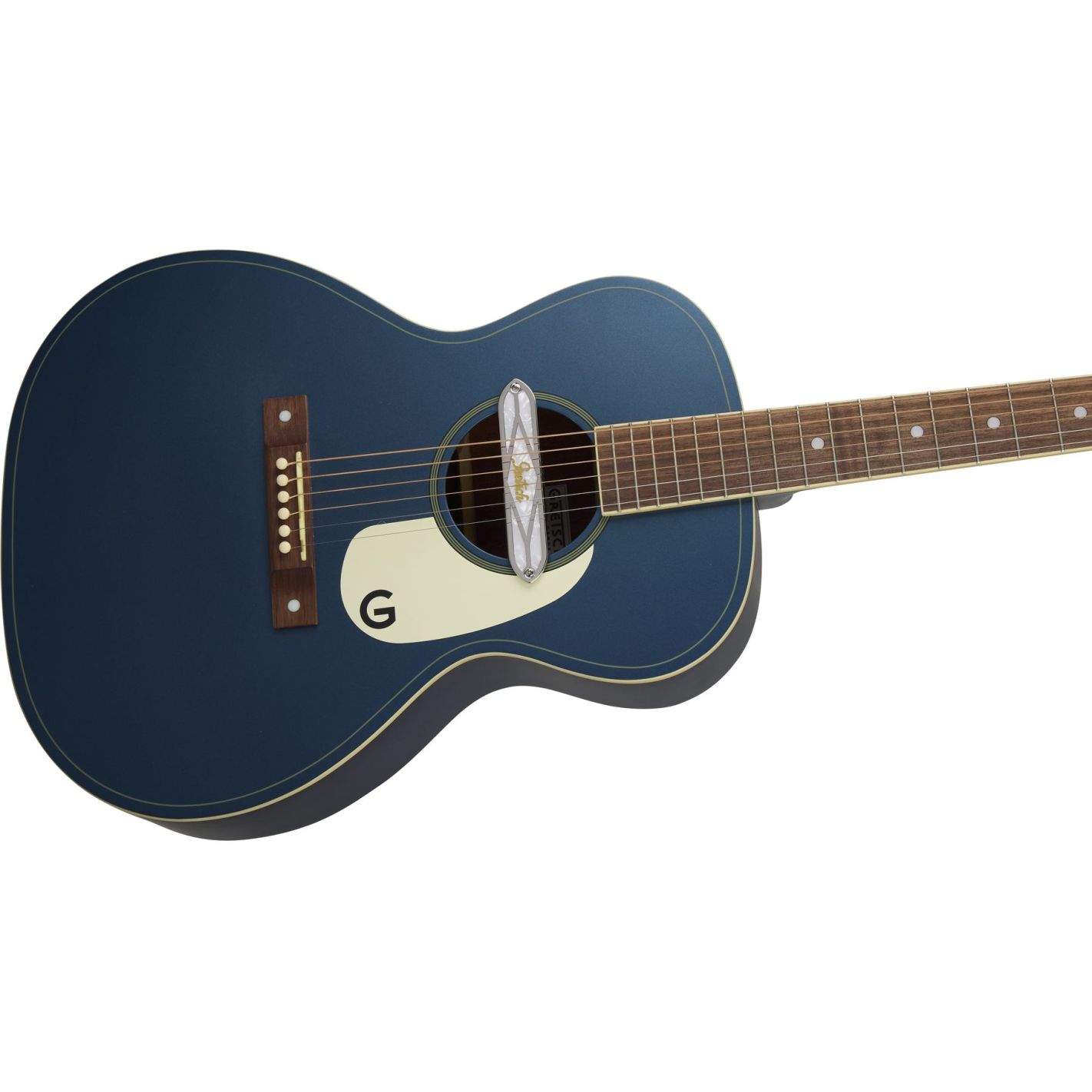 Su cuerpo tipo concierto está fabricado en madera laminada ligera con varetaje en X, lo que aporta un tono equilibrado y resonante, perfecto tanto para rasgueos como para fingerpicking. El acabado Dark Denim en semi-brillo, combinado con un golpeador envejecido con el icónico gráfico “G” y ribetes pintados, refuerza la estética vintage del instrumento.
