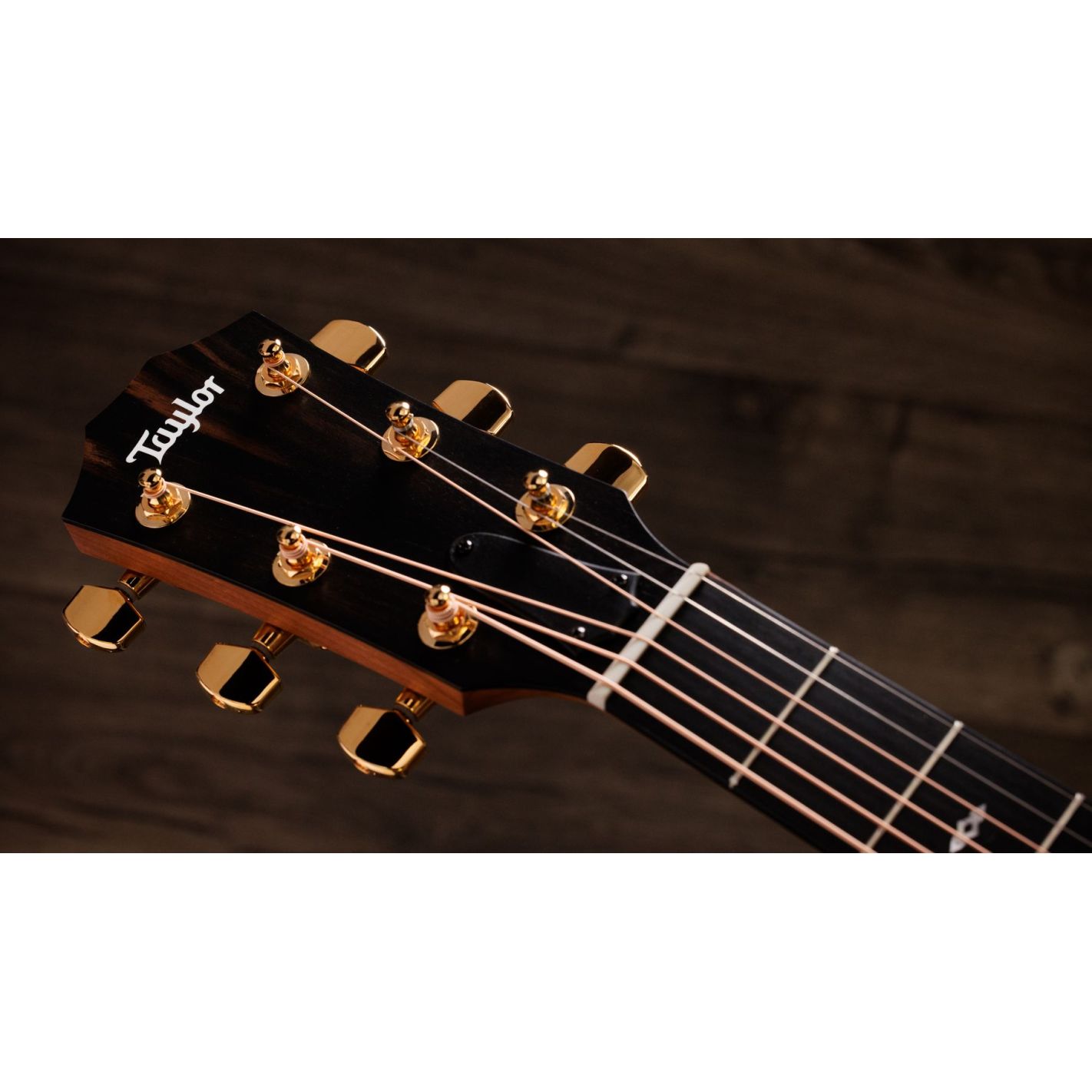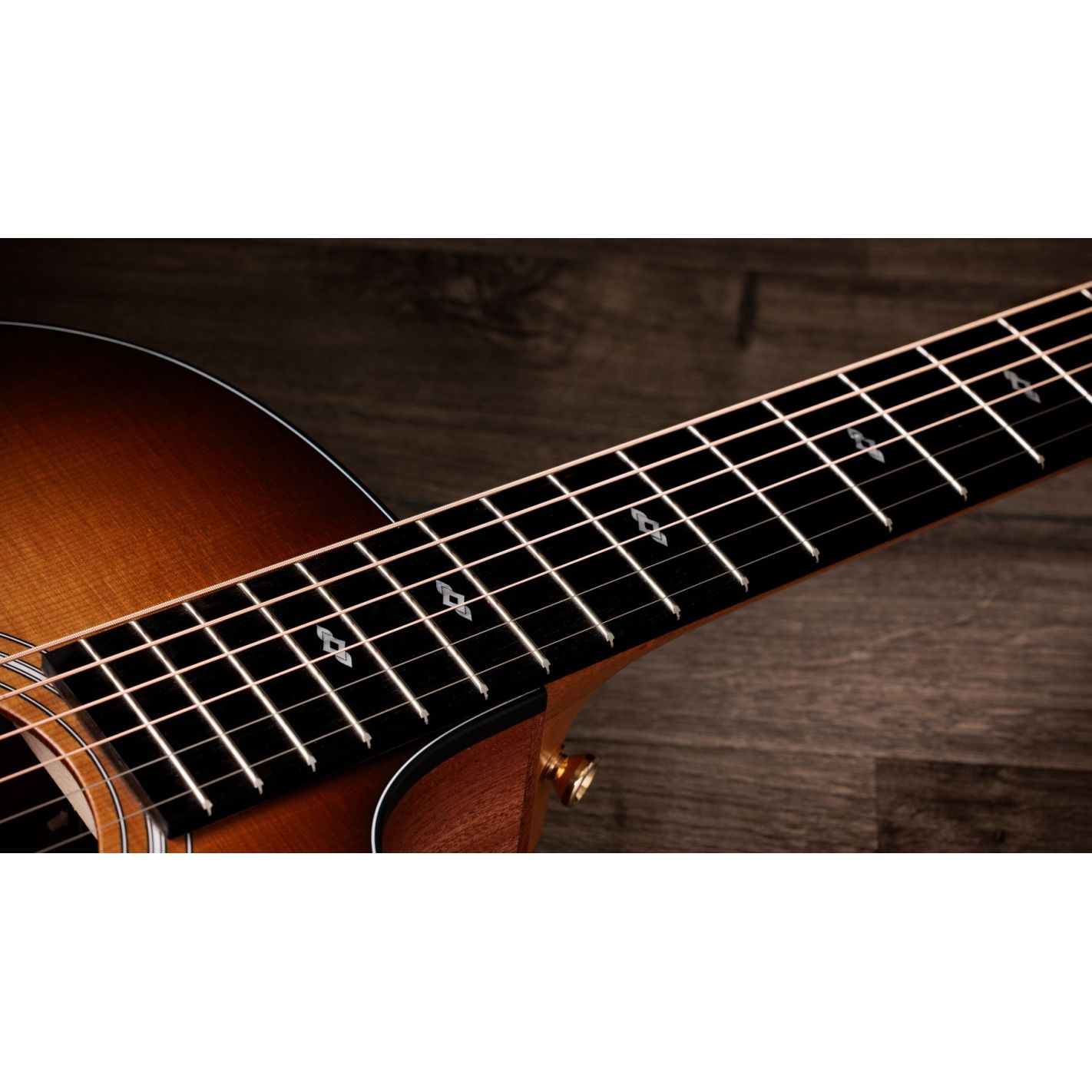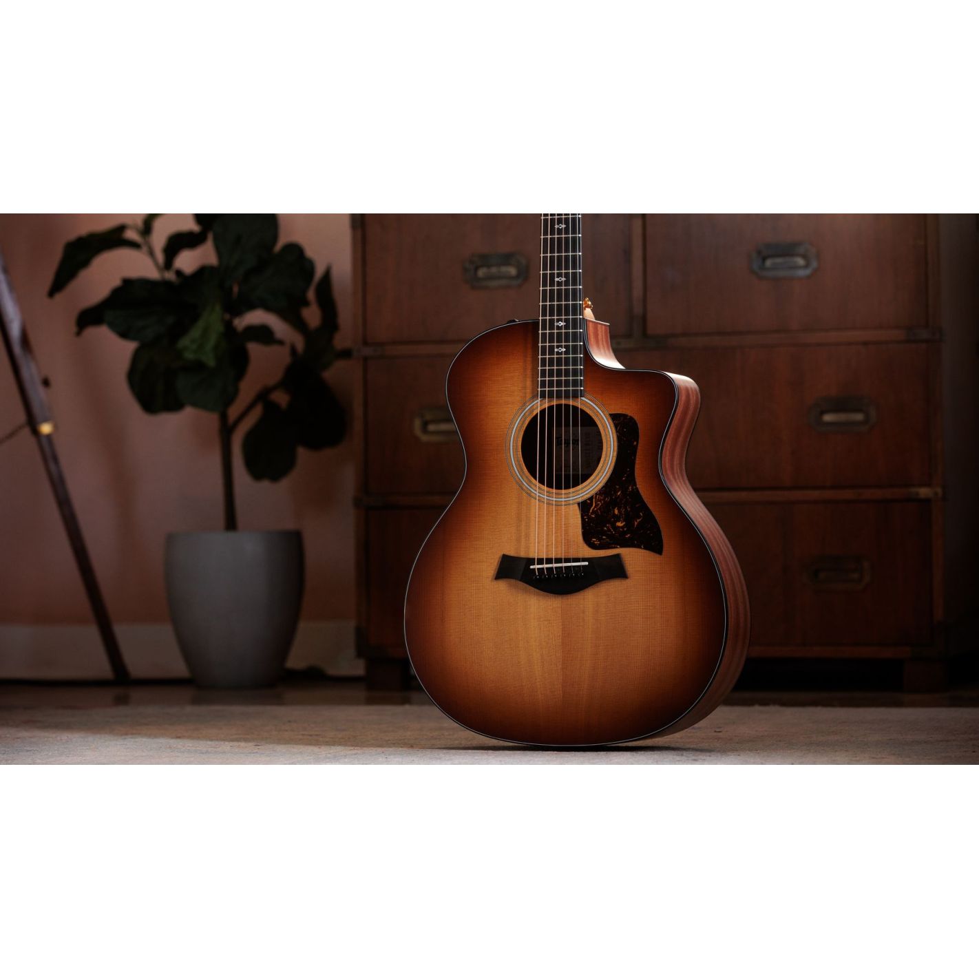 Guitarra acústica Taylor Sunset Blvd 114ce SEB - Cuerpo Grand Auditorium con cutaway veneciano, tapa maciza de pícea de Sitka torrefactada, aros y fondo de sapeli laminado, acabado Sunset Edgeburst satinado. Varetaje V-Class cantilevered para mayor volumen, sustain y entonación. Mástil de caoba o arce con perfil delgado y acabado mate. Diapasón de ébano o eucalipto con incrustaciones de diamante en acrílico italiano, 20 trastes. Escala de 25.5" (648 mm). Puente de ébano con selleta compensada. Electrónica Expression System 2. Clavijeros dorados. Incluye funda blanda tipo gig bag.