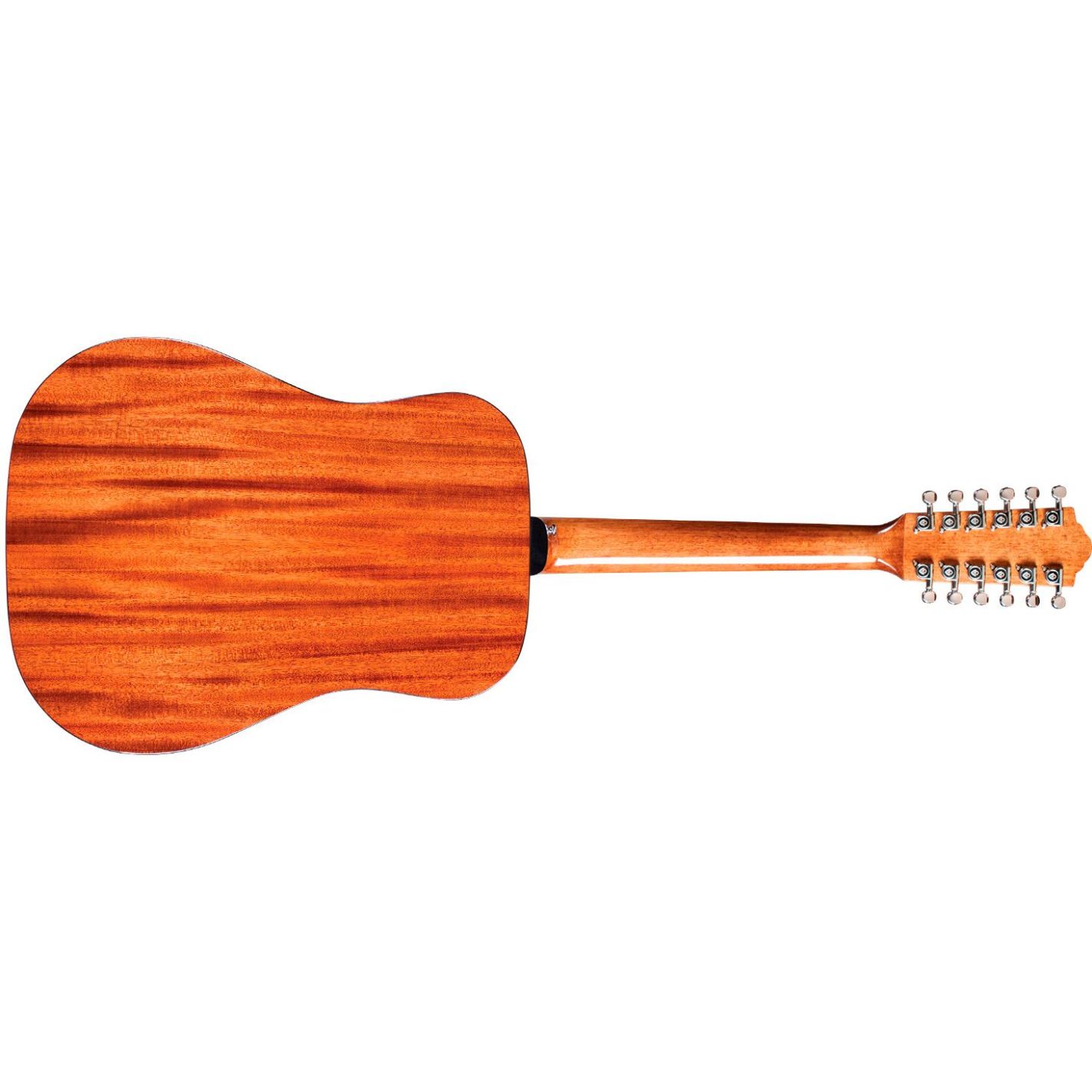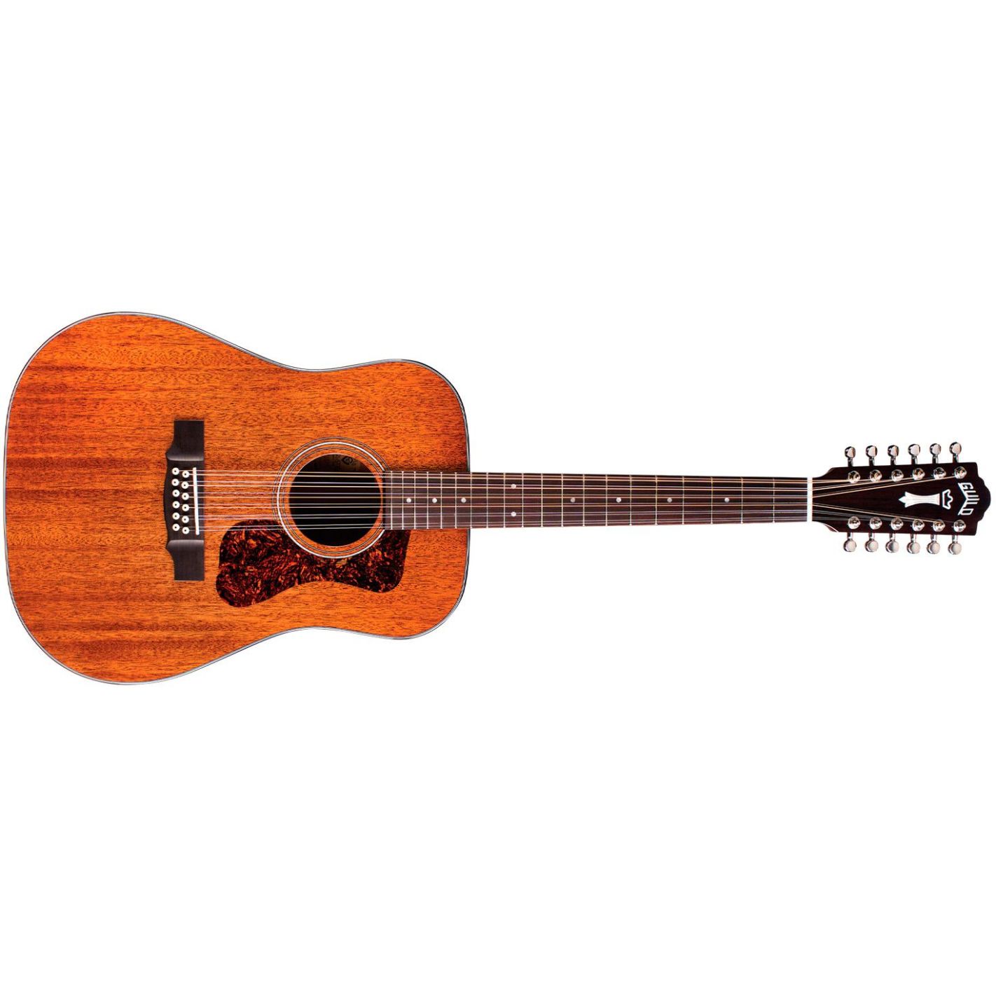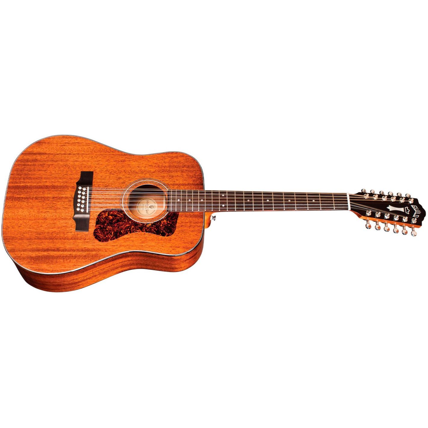 Guitarra acústica 12 Cuerdas Guild D-1212 NAT W/B Natural - Cuerpo tipo dreadnought con tapa, aros y fondo de caoba africana maciza, varetaje tipo OX y roseta de tres anillos con centro de nácar. Ribete y fileteado superior marfil/negro/marfil/negro, borde en ABS negro. Mástil de caoba africana en perfil “C”, escala de 25.5" (648 mm) y cejuela de hueso de 48 mm. Diapasón de palisandro con radio de 16", 20 trastes e incrustaciones de puntos de nácar. Puente de palisandro con selleta de hueso compensada y pines marfil con punto negro. Golpeador carey, herrajes niquelados y clavijeros Guild
