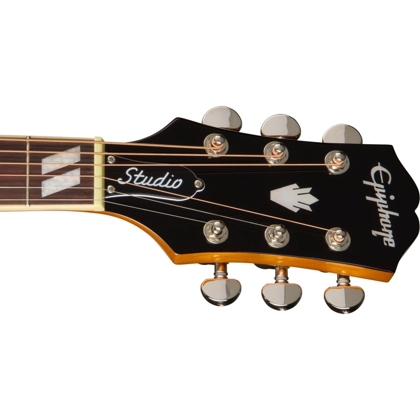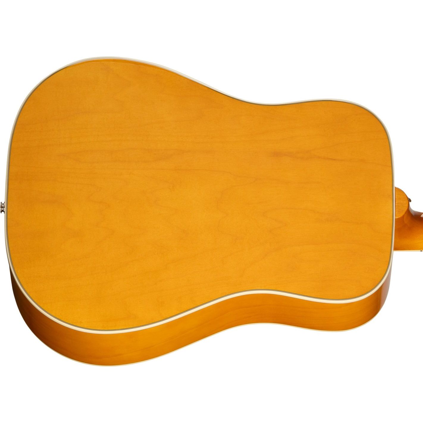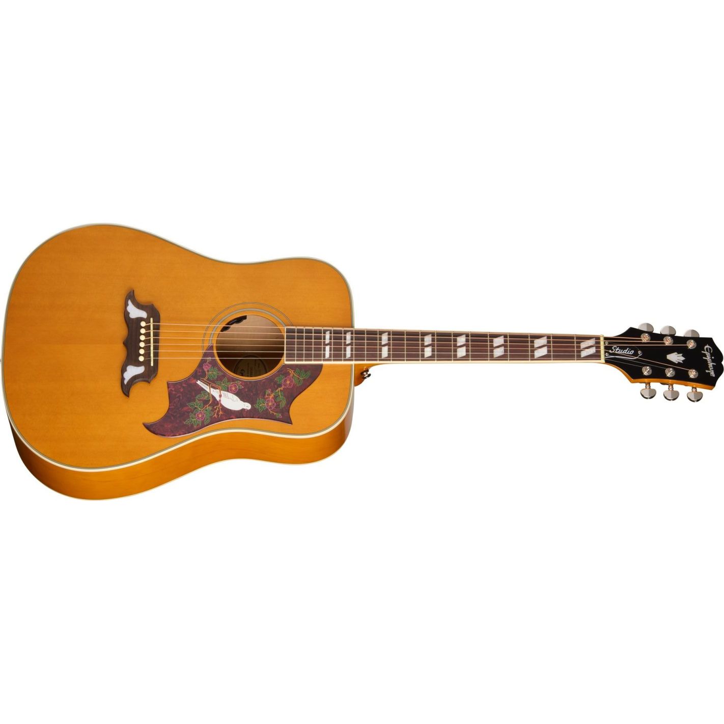 Guitarra acústica Epiphone Dove Studio, Natural - Cuerpo estilo dreadnought cuadrado Dove con fondo y aros de arce laminado, tapa de abeto macizo, binding envejecido de 6 capas en tapa y 4 en trasera, y una capa en diapasón. Mástil de caoba perfil Rounded C con diapasón de palisandro, 20 trastes, escala de 25.5" (647.7 mm), cejuela plástica de 43 mm, incrustaciones pearloid parallelogram. Puente belly-up de palisandro con incrustaciones pearloid Dove y pins plásticos marfil. Golpeador Dove epóxico con gráficos característicos. Clavijeros Grover Rotomatic. Electrónica Fishman S-Core con preamplificador Fishman Presys VT, controles de volumen y tono montados en boca. Acabado brillante. Hardware niquelado.
