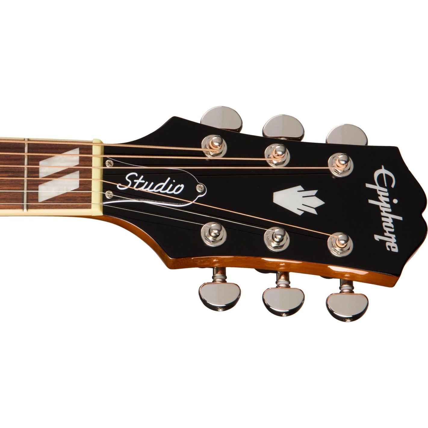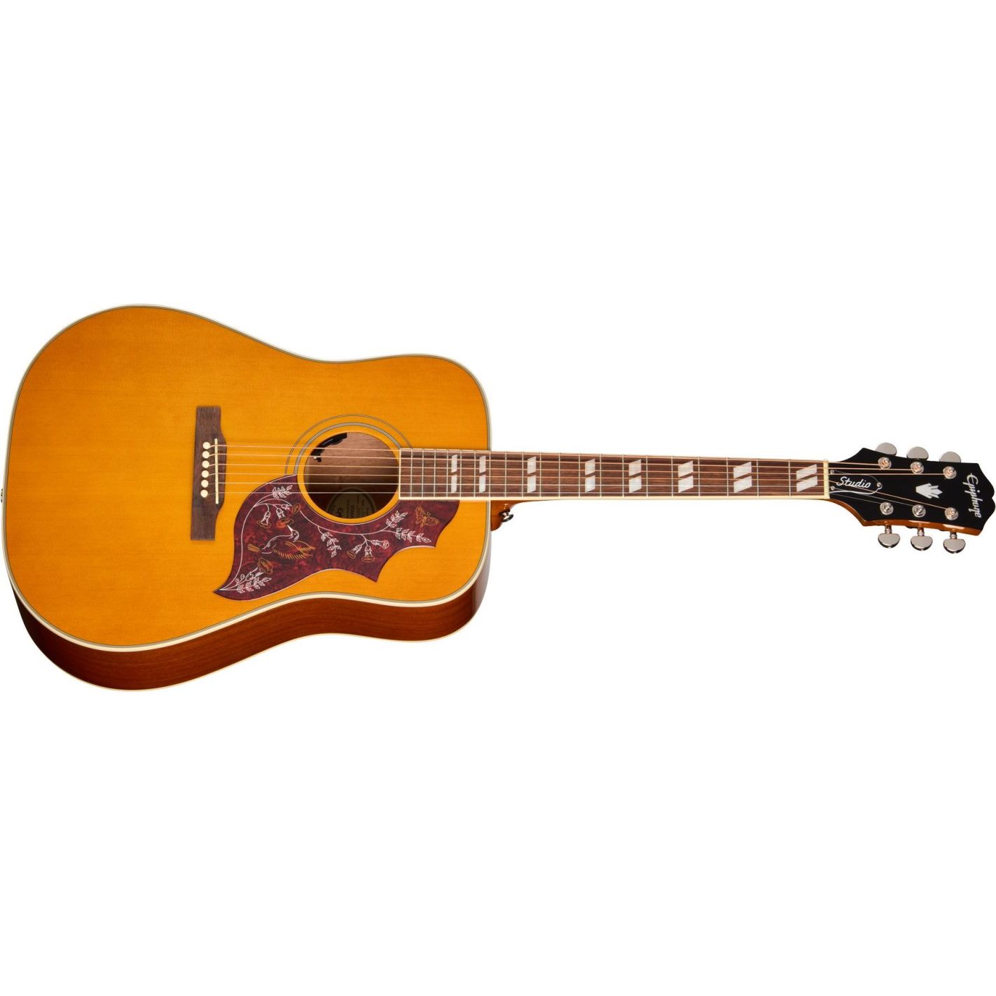 Guitarra acústica Epiphone Hummingbird Studio, Antique Natural - Cuerpo estilo dreadnought cuadrado Hummingbird con fondo y aros de caoba laminada, tapa de abeto macizo, binding envejecido de 6 capas en tapa, 4 en trasera y una capa en diapasón. Mástil de caoba perfil Rounded C con diapasón de palisandro, 20 trastes, escala de 24.75" (628.65 mm), cejuela plástica de 43 mm, incrustaciones pearloid parallelogram. Puente belly-up de palisandro con pins plásticos marfil. Golpeador Hummingbird tortoise shell epóxico con gráficos característicos. Clavijeros Grover Rotomatic. Electrónica Fishman S-Core con preamplificador Fishman Presys VT, controles de volumen y tono montados en boca. Acabado brillante. Hardware niquelado.