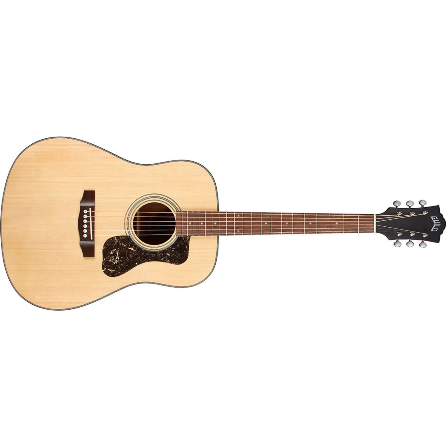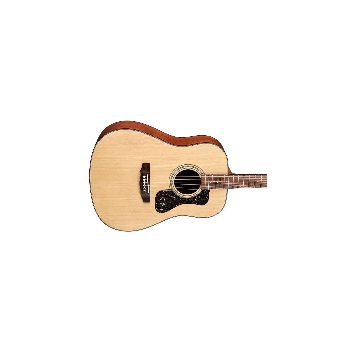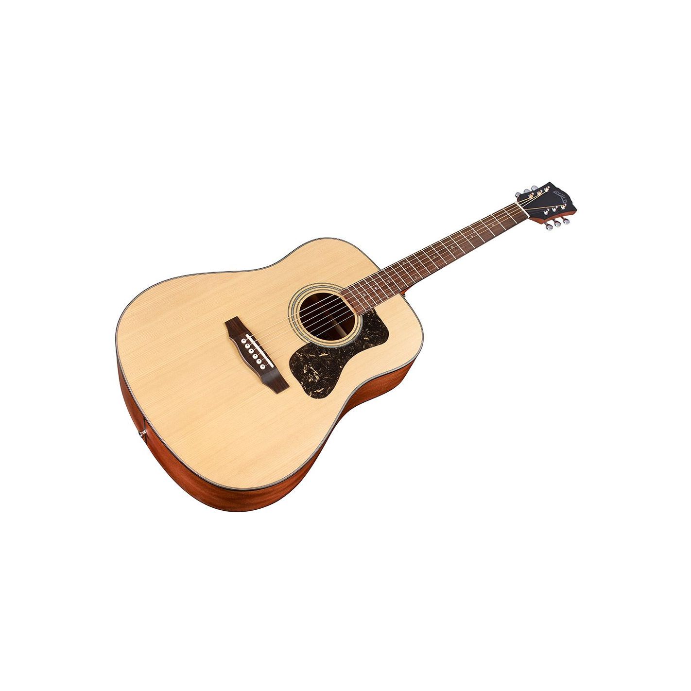 Guitarra acústica Guild D-340 Natural - Tapa maciza de abeto, aros y fondo de caoba. Cuerpo tipo dreadnought. Mástil con perfil en “C” cómodo. Diapasón y puente de palisandro. Ribetes negros con golpeador carey oscuro. Acabado satinado natural de poro abierto. Clavijeros Guild Vintage 16 de engranaje abierto. Logotipo Guild en níquel.