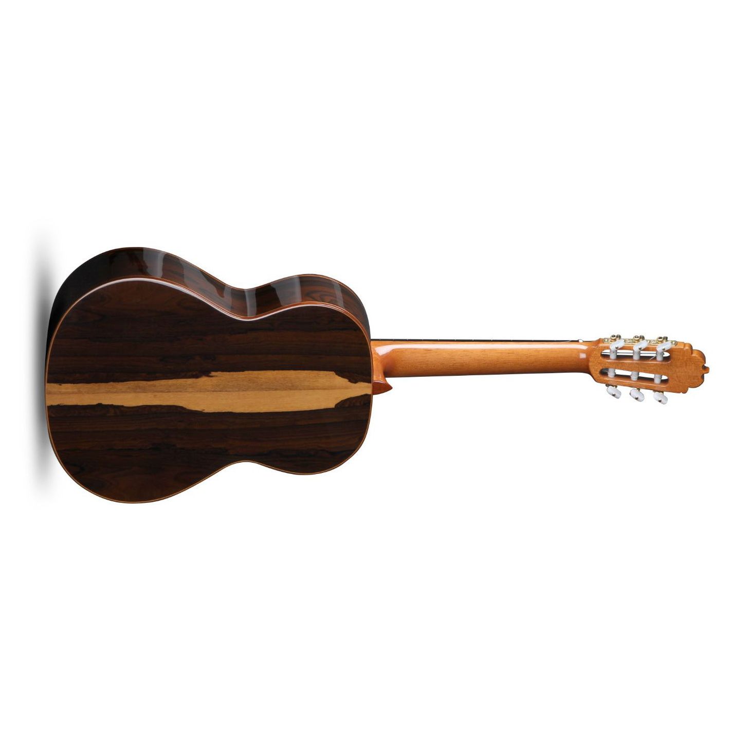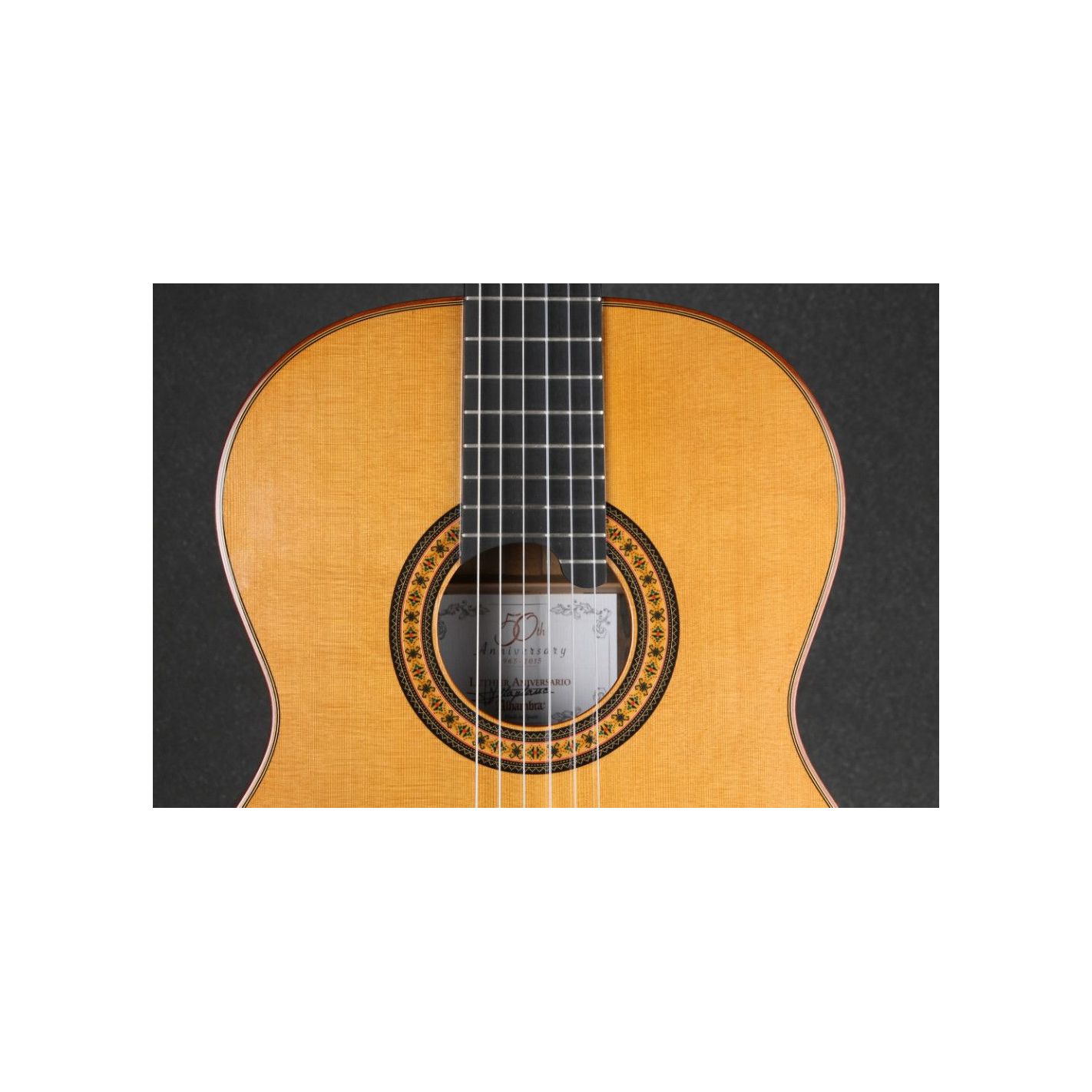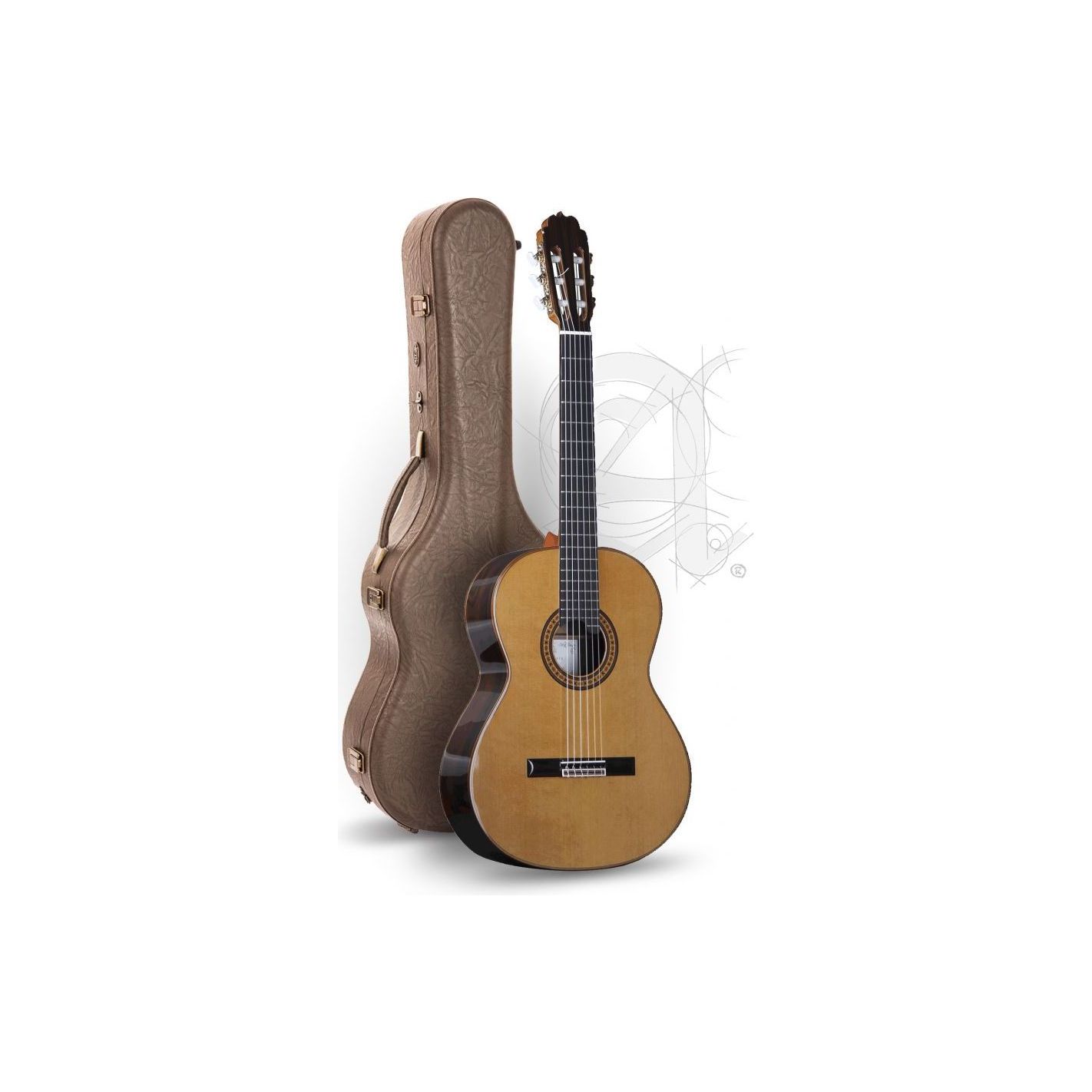 Guitarra Alhambra Luthier Aniversario - Laca nitro en tapa brillo. Tapa de Cedro Macizo. Aros y fondo de Ziricote Macizo. Mango de Cedro, reforzado con ébano, Ergonech. Diapasón de Ébano. Clavijeros Schaller Grand Tune Classic Hauser. Silleta de hueso. Cuerdas EXP 44 Extra Hard Tension. Varetaje Japanese House. Estuche incluido.