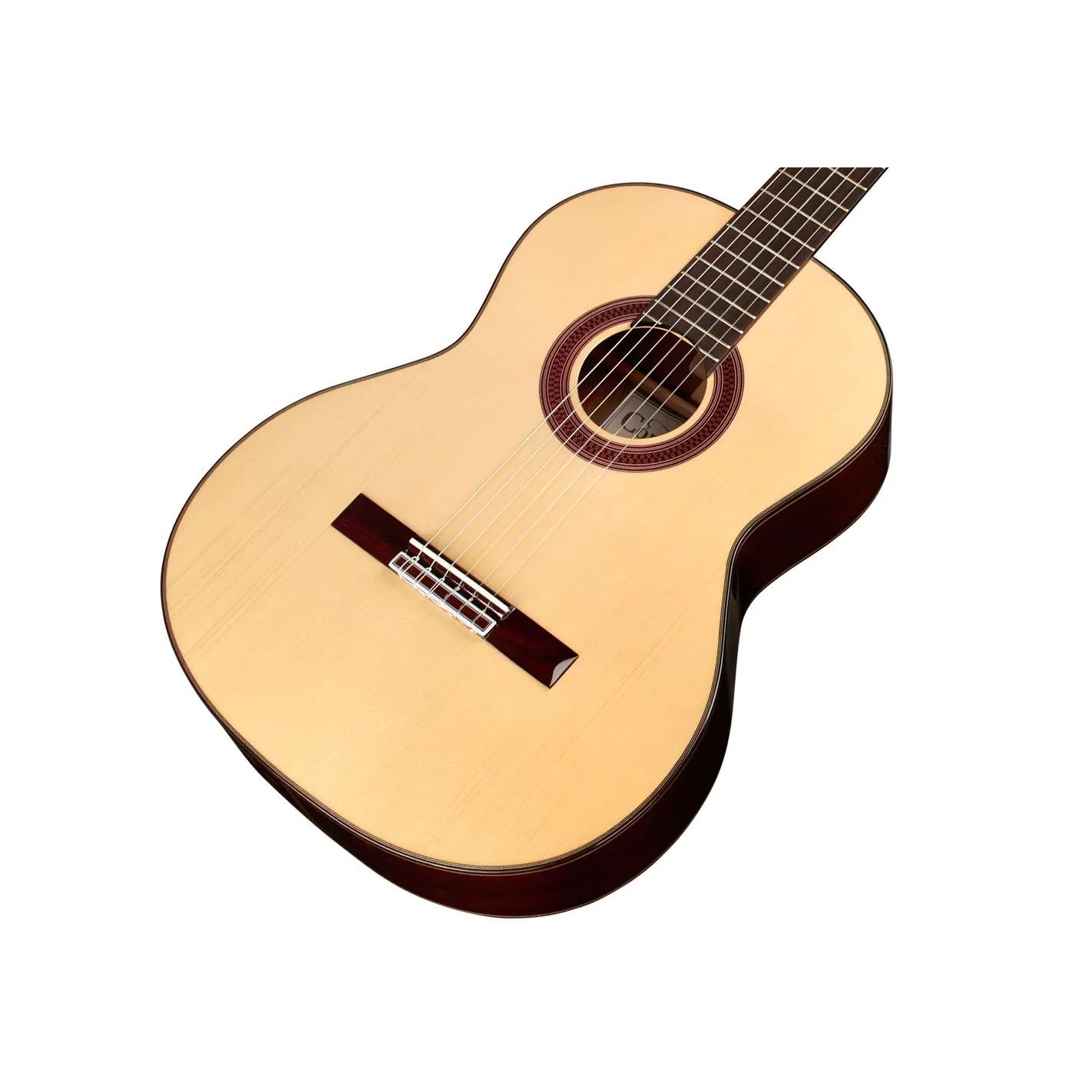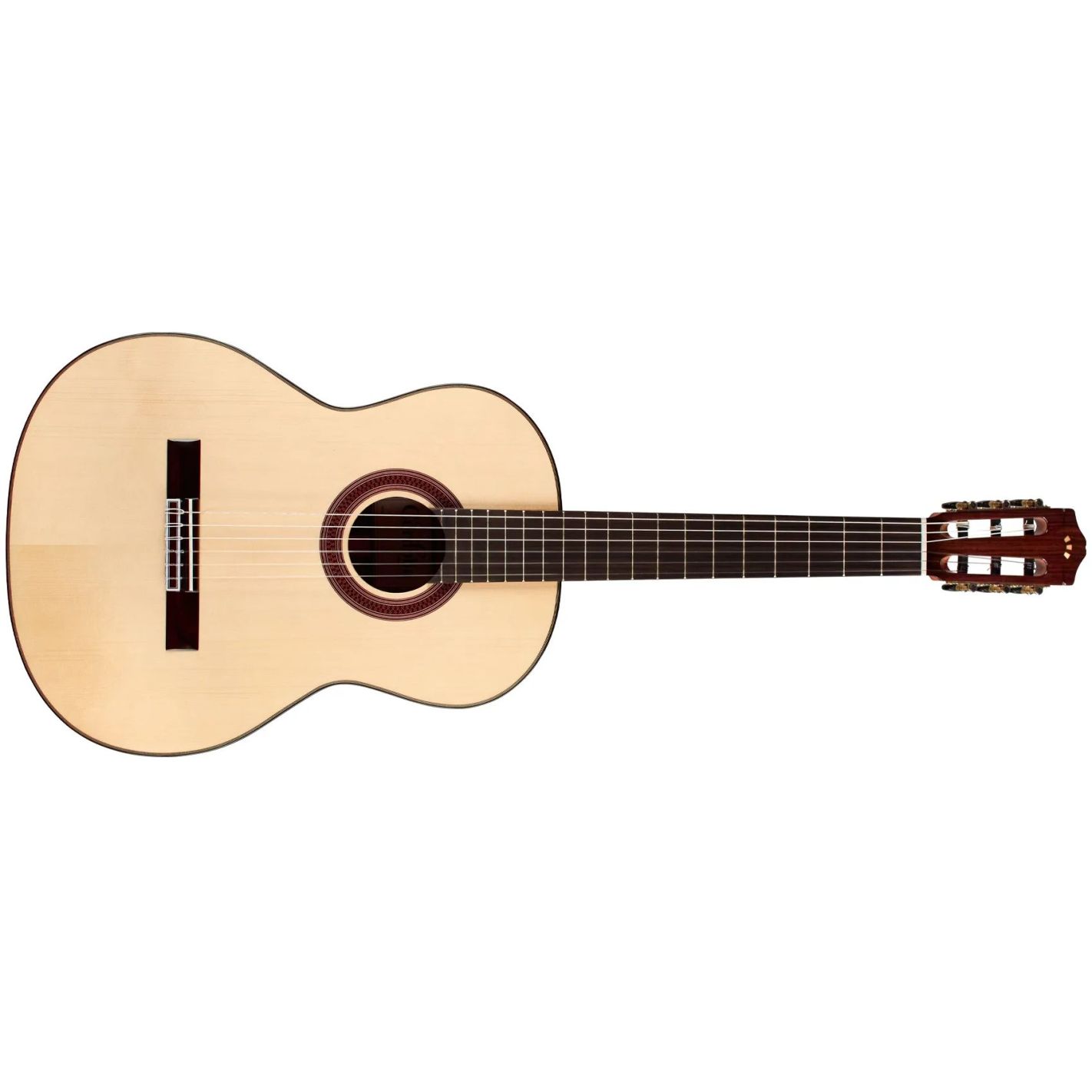 Guitarra clásica Cordoba C7 SP, Natural - Cuerpo con tapa sólida de abeto europeo y aros y fondo de palosanto de India, con fileteado trasero triple de arce y negro. Construcción tradicional con varetaje tipo abanico que maximiza la resonancia y el sustain. Mástil de caoba en forma C con unión tipo dovetail y alma de doble acción. Diapasón y puente de palosanto. Cejuela y selleta de hueso. 12 trastes al cuerpo. Roseta de madera incrustada a mano. Acabado brillante en poliuretano. Clavijeros con botones negros y relación 14:1. Ideal para guitarristas principiantes o intermedios que buscan un