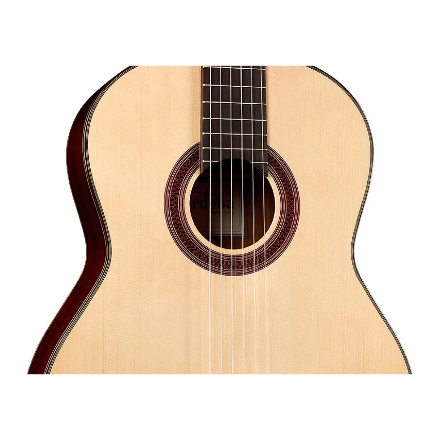 Guitarra clásica Cordoba C7 SP, Natural - Cuerpo con tapa sólida de abeto europeo y aros y fondo de palosanto de India, con fileteado trasero triple de arce y negro. Construcción tradicional con varetaje tipo abanico que maximiza la resonancia y el sustain. Mástil de caoba en forma C con unión tipo dovetail y alma de doble acción. Diapasón y puente de palosanto. Cejuela y selleta de hueso. 12 trastes al cuerpo. Roseta de madera incrustada a mano. Acabado brillante en poliuretano. Clavijeros con botones negros y relación 14:1. Ideal para guitarristas principiantes o intermedios que buscan un sonido clásico cálido y equilibrado.