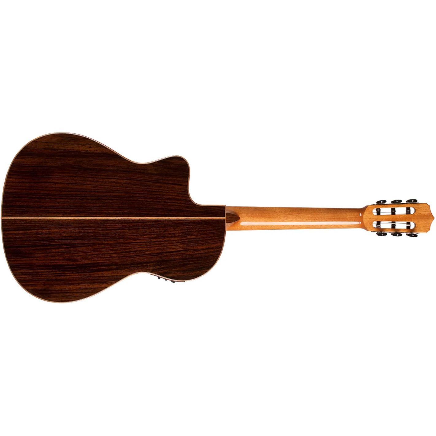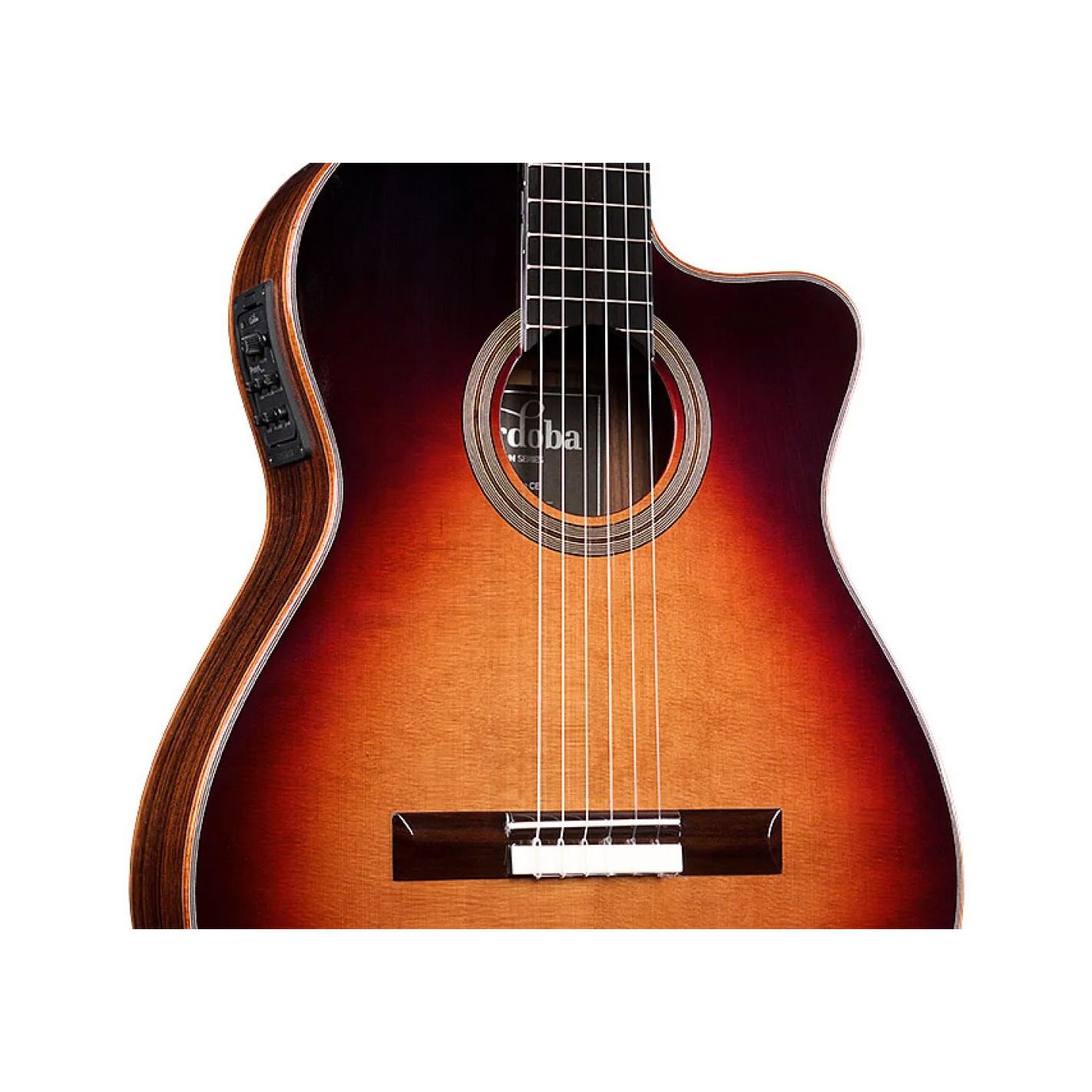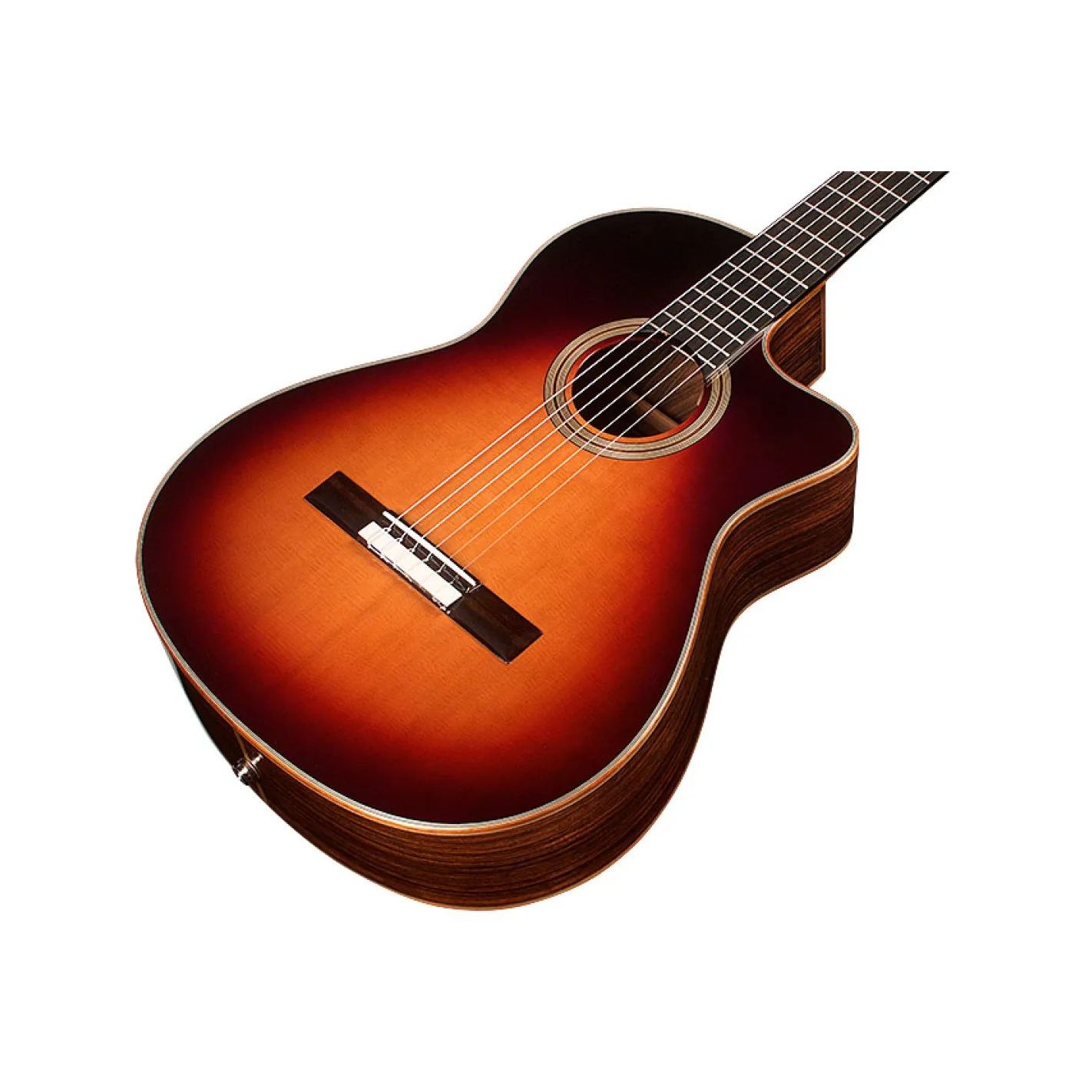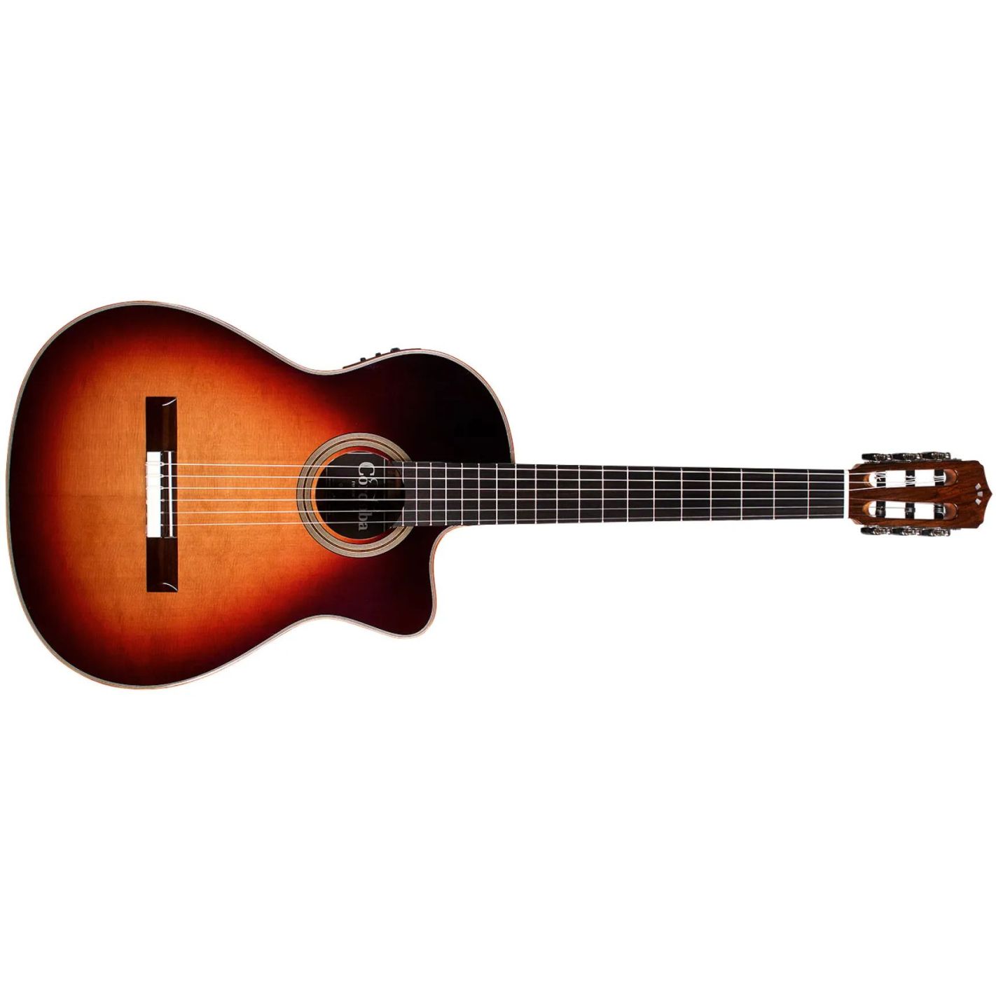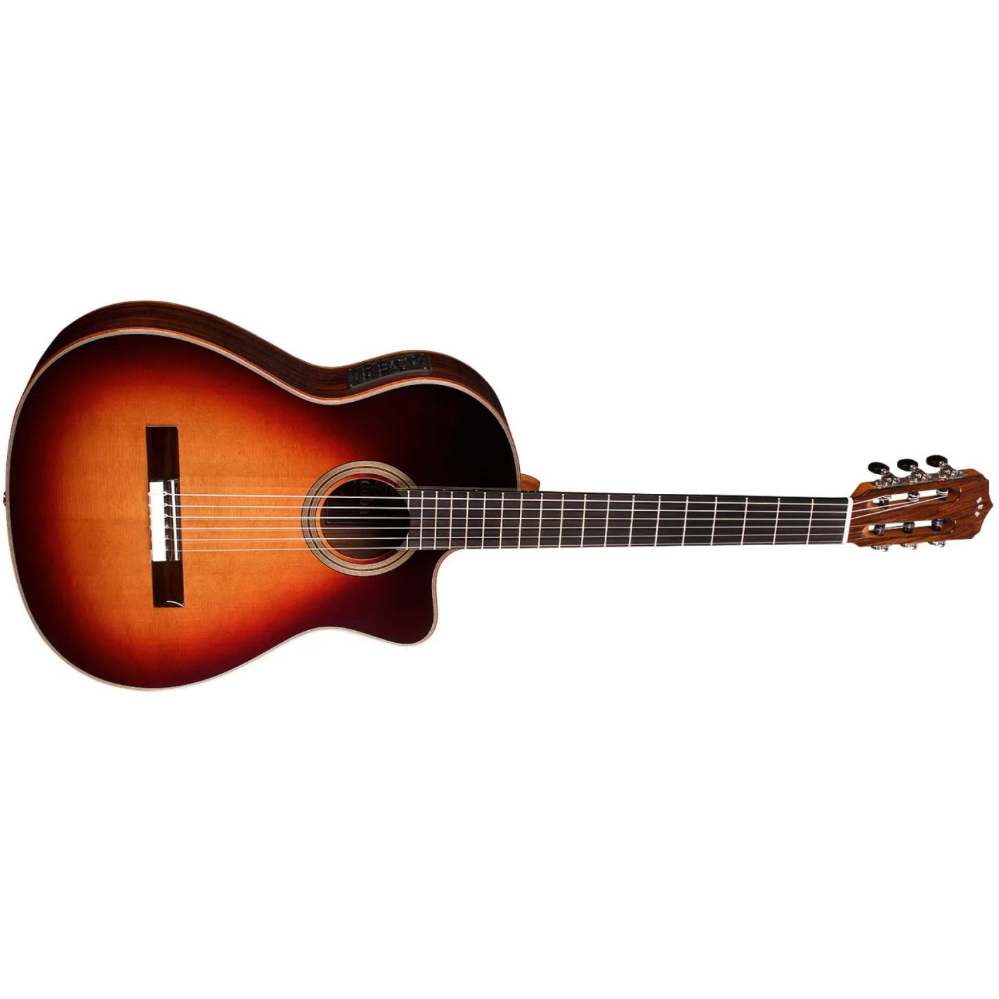 Guitarra clásica Cordoba Fusion Orchestra CE Teardrop Burst - Cuerpo tipo Fusion con cutaway suave y tapa maciza de cedro canadiense, aros y fondo de palisandro. Mástil de caoba con perfil Crossover “C”, unión dovetail y diapasón de ébano con radio de 16" (12 trastes al cuerpo). Cejuela y selleta de hueso. Varetaje tipo abanico y puente de palisandro. Binding y fileteado trasero de caoba con incrustaciones en arce y negro, roseta artesanal de madera incrustada. Clavijeros plateados con botones negros (relación 14:1). Sistema Fishman Presys Blend con piezo y micrófono integrados.