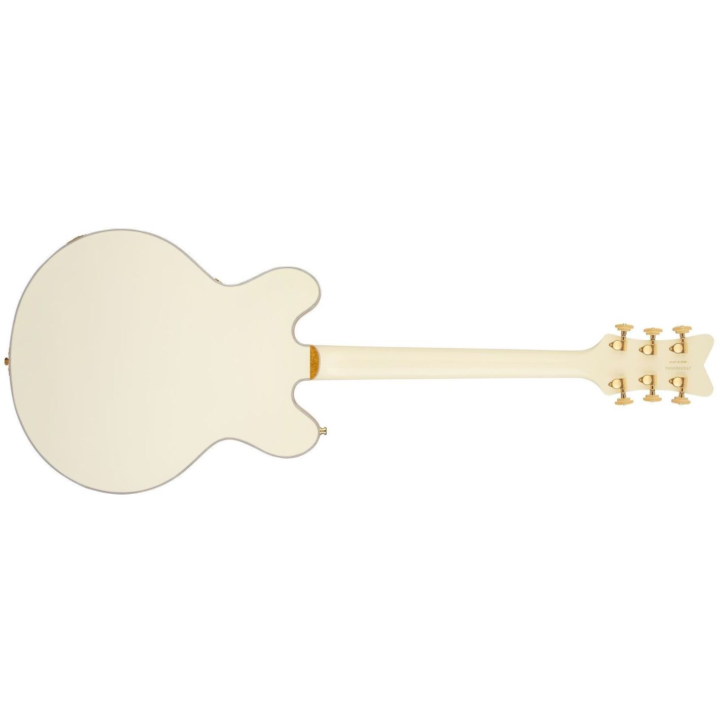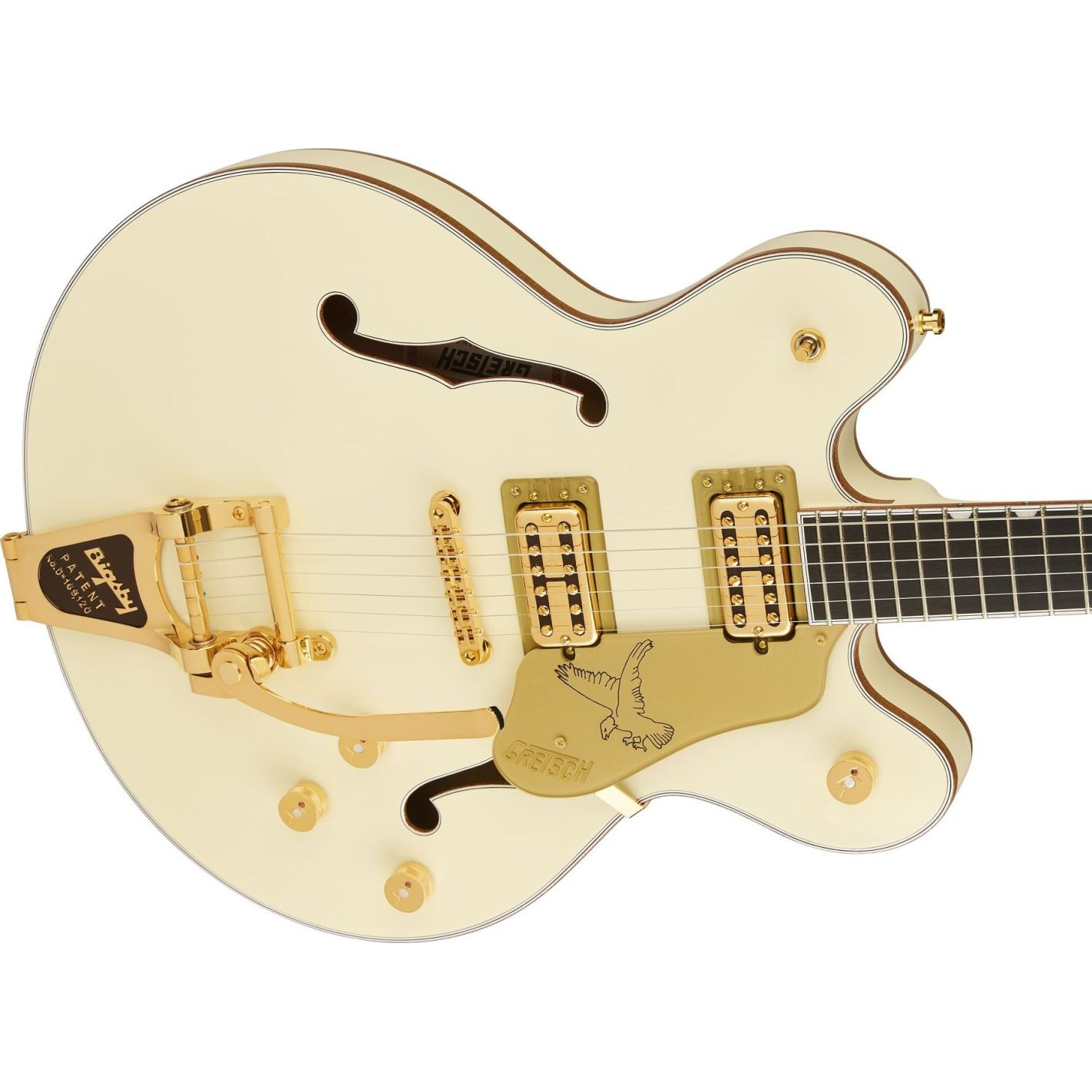 Guitarra eléctrica semi-hollow Gretsch Falcon Center Block LTD Double-Cut with String-Thru Bigsby, Ebony Fingerboard, Vintage White - Cuerpo de arce laminado arqueado con bloque central Channel Core de arce y abeto, doble cutaway y acabado gloss. Mástil encolado de arce con perfil Standard U y acabado brillante. Diapasón de ébano con radio de 12" (305 mm), bordes redondeados, incrustaciones Pearloid Neo Classic Thumbnail, puntos laterales Luminlay, 22 trastes medium jumbo y cejuela Graph Tech TUSQ XL de 42,86 mm. Escala de 24.6" (625 mm). Pastillas TV Jones TV Classic (mástil) y TV Classic Plus (puente). Controles de volumen individuales, volumen maestro con treble bleed y tono maestro no-load con condensador Squeezebox. Selector de 3 posiciones. Puente Adjusto-Matic anclado y trémolo Bigsby B7GP con sistema string-thru. Clavijeros Grover Imperial Locking y cierres de correa Grover. Golpeador dorado plexi con logotipo Gretsch y gráfico Falcon. Hardware dorado. Acabado Vintage White con ribetes Gold Sparkle y purfling W/B/W/B. Estuche rígido G6267 incluido.