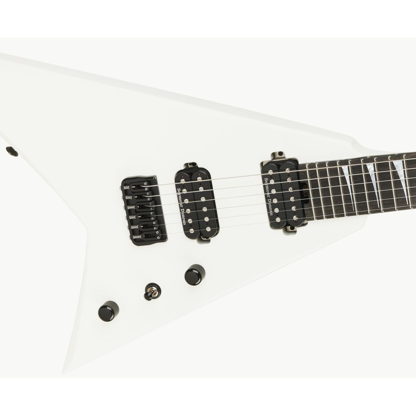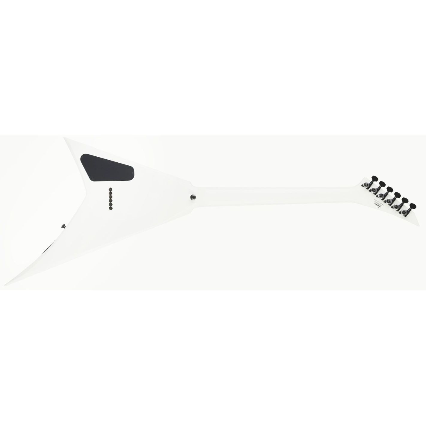 Su cuerpo de aliso destaca por la forma Rhoads y el acabado blanco brillante. El mástil de arce de tres piezas en construcción neck-through con refuerzo de grafito presenta perfil Speed Neck y acabado satinado para velocidad y comodidad. El diapasón de ébano con radio compuesto 12”-16” y bordes redondeados integra 24 trastes jumbo de acero inoxidable, incrustaciones invertidas de aleta de tiburón en madreperla y marcadores Luminlay.