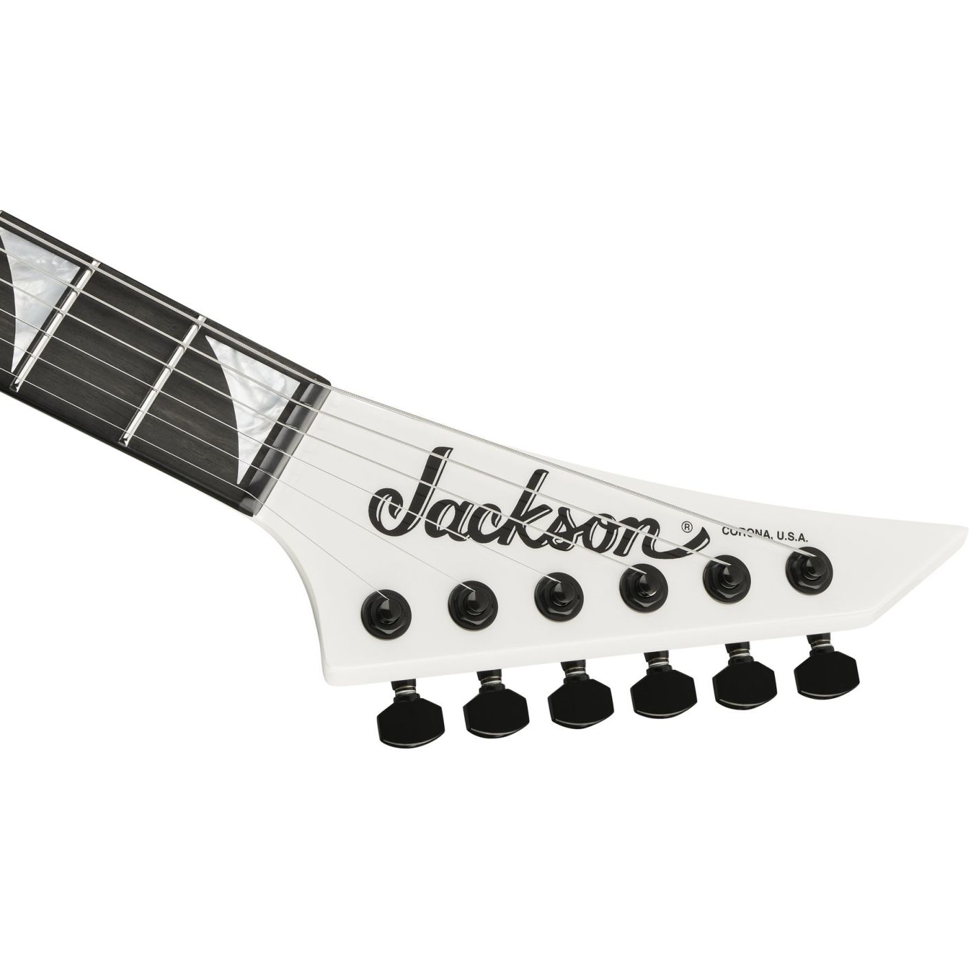 Guitarra eléctrica Jackson American Series Rhoads RR24 HT Snow White - Cuerpo de aliso en forma Rhoads con acabado Gloss Snow White. Mástil de arce de tres piezas neck-through con refuerzo de grafito y acabado satinado a juego, perfil Speed Neck, pala invertida Jackson Pointed 6 en línea. Diapasón de ébano con radio compuesto 12”-16”, bordes redondeados, 24 trastes jumbo de acero inoxidable, incrustaciones de aleta de tiburón invertida en madreperla y marcadores Luminlay. Escala de 25.5” (648 mm), cejuela Graph Tech TUSQ XL de 42,86 mm, alma dual-action con ajuste de rueda. Configuración HH con pastillas Seymour Duncan JB TB-4 (puente) y ’59 SH-1N (mástil), controles de volumen y tono, selector de 3 posiciones. Puente fijo Hipshot 6 con espaciado .125”, clavijeros Gotoh MG-T con bloqueo, enganches de correa Dunlop Dual-Locking, herrajes en negro. Incluye estuche Jackson RR Foam Core.