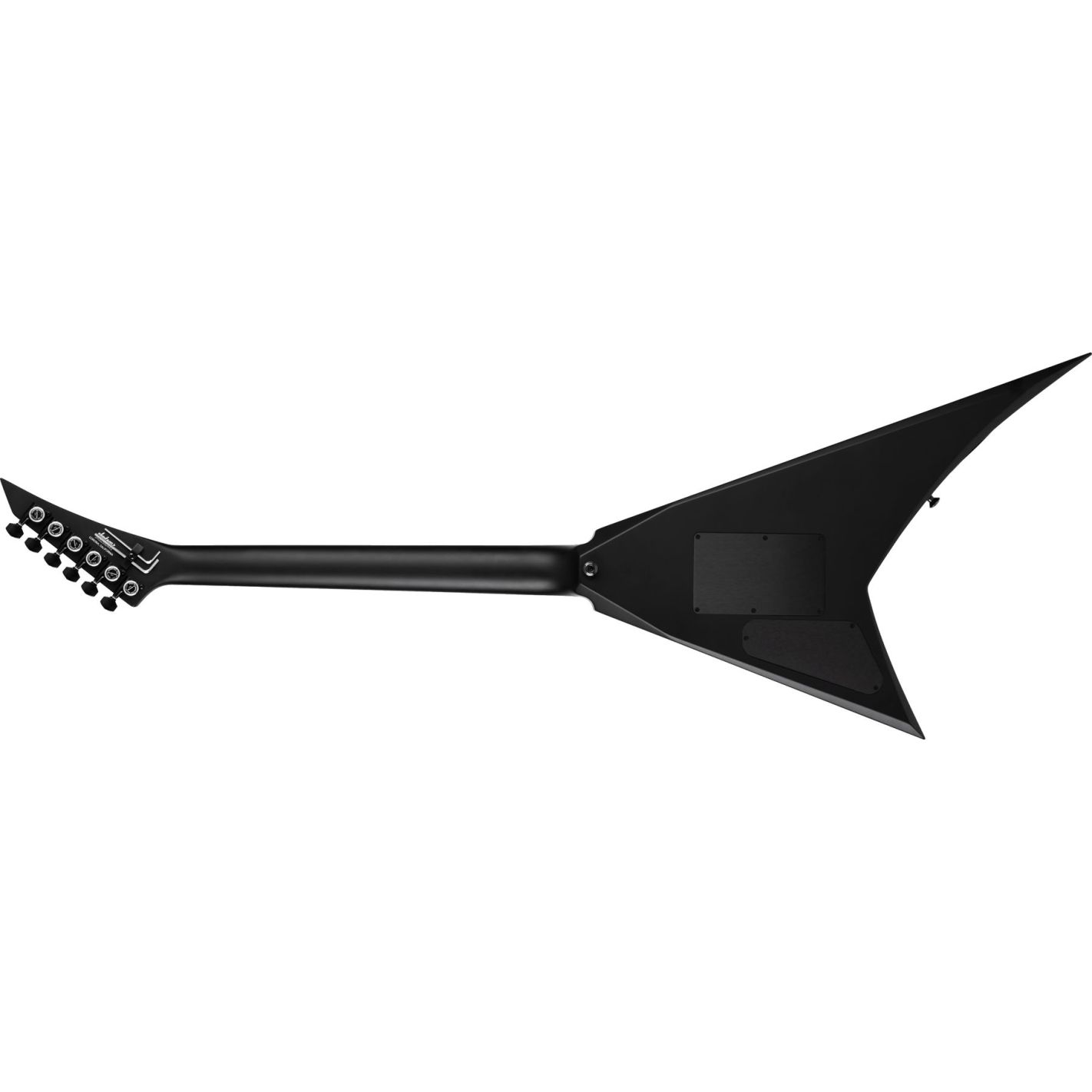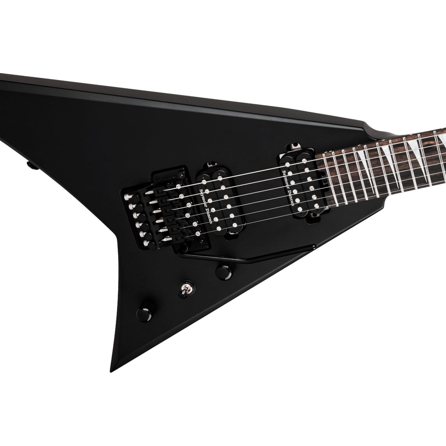 Guitarra eléctrica Jackson American Series Rhoads RR24 Satin Black - Cuerpo de aliso con acabado satinado. Mástil de arce de tres piezas en construcción neck-through con refuerzos de grafito y acabado satinado a juego, pala invertida Jackson Pointed 6 en línea. Diapasón de ébano con radio compuesto 12”-16”, 24 trastes jumbo de acero inoxidable, incrustaciones de aleta de tiburón invertida en madreperla y marcadores Luminlay. Cejuela y sistema de bloqueo Floyd Rose Serie 1500, escala 25.5” (648 mm), cejuela de 42,86 mm. Pastillas activas EMG 81 (puente) y 85 (mástil), configuración HH, controles de volumen y tono independientes, selector de 3 posiciones. Puente Floyd Rose Serie 1500 de doble bloqueo, clavijeros Gotoh MG-T con bloqueo, enganches Dunlop Dual-Locking, herrajes en negro. Incluye estuche Jackson RR Foam Core.