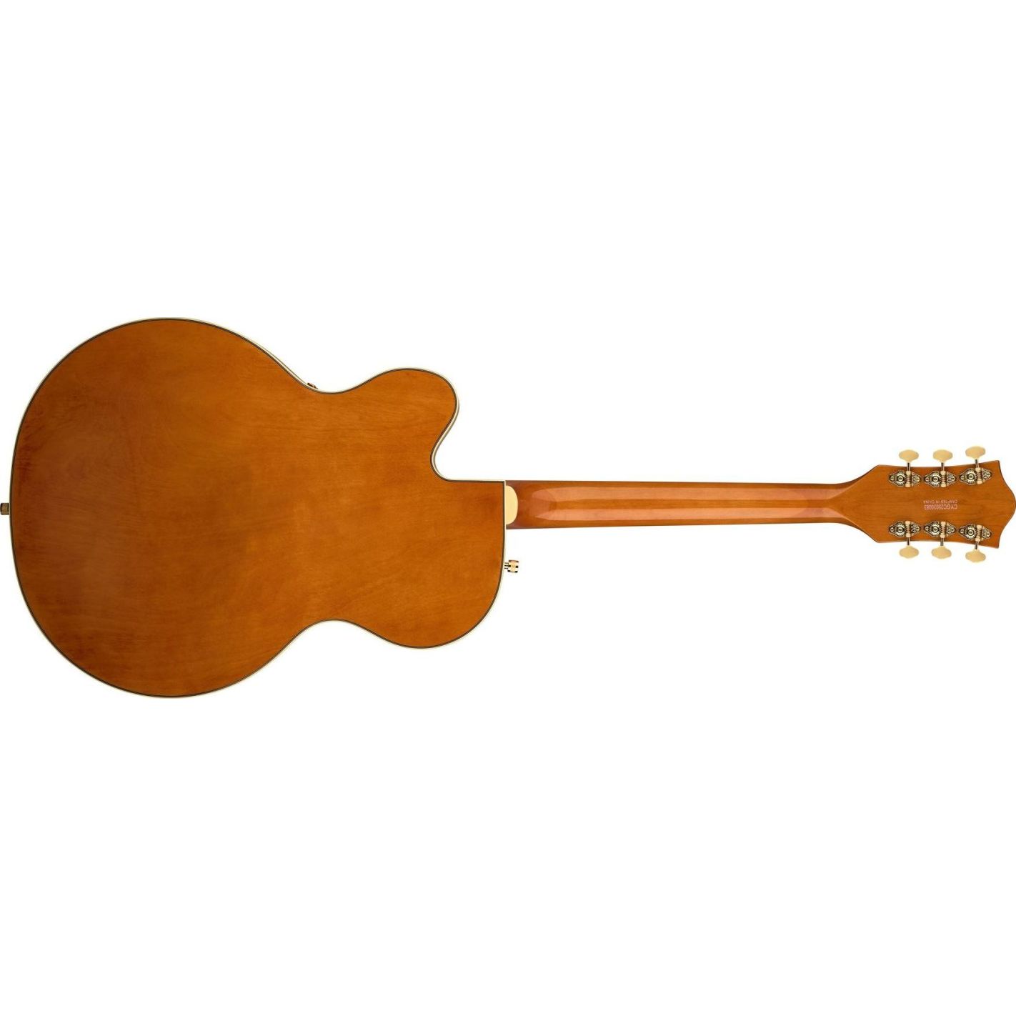 Guitarra eléctrica Gretsch Synchromatic Nashville Hollow Body Single-Cut with Bigsby, Ebony Fingerboard, 50's Orange Stain - Cuerpo de arce laminado arqueado de 2.5" con cutaway simple, refuerzos Semi-Arc y binding multicapas envejecido. Tapa, aros y fondo de arce laminado arqueado con orificios en “f” encuadernados. Mástil de arce encolado con perfil Classic “C”, acabado gloss y 22 trastes medium jumbo. Escala de 24.6" (625 mm). Diapasón de ébano con radio de 12" (305 mm), incrustaciones Neo-Classic “thumbnail” en pearloid y cejuela de hueso de 42,9 mm. Pastillas Hi-Fidelity Filter’Tron (mástil/puente), controles de volumen individual, master volume con treble bleed y master tone, selector de 3 posiciones. Puente Adjusto-Matic con base de ébano asegurada y vibrato Bigsby B60 V-Cutout. Golpeador plexi dorado con logo Gretsch, herrajes dorados con clavijeros vintage open-back. Incluye estuche rígido deluxe.