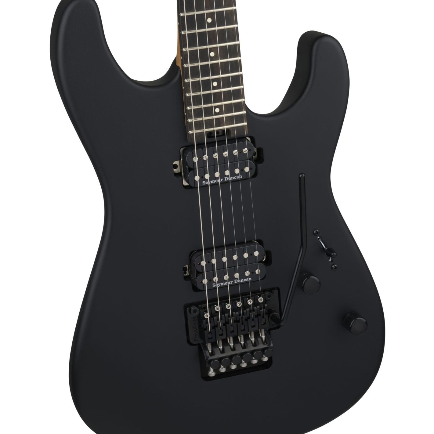 En cuanto a las pastillas, esta guitarra está equipada con una Seymour Duncan JB TB-4 en el puente y una Seymour Duncan '59 SH-1N en el mástil, ofreciendo una configuración HH con una amplia gama tonal. El selector de 5 posiciones permite combinaciones versátiles: puente, bobinas externas e internas, y mástil. Los controles incluyen un potenciómetro de volumen de baja fricción Bourns y un tono No-Load para mayor precisión. Su puente Floyd Rose 1500 Series Double-Locking Tremolo asegura estabilidad de afinación y permite técnicas de palanca extremas. Además, el hardware negro, los clavijeros Charvel Gotoh y la funda Charvel Multi-Fit Gig Bag completan este extraordinario modelo.