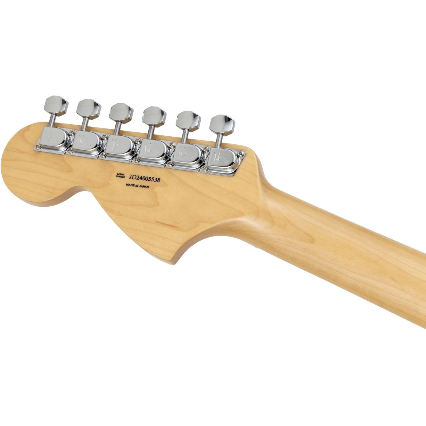 Guitarra eléctrica Fender Made in Japan Limited Stratocaster, Maple Fingerboard, Black Paisley - Cuerpo de aliso con acabado gloss polyester y forma Stratocaster. Mástil de arce en forma "U" de 1969 con acabado gloss urethane. Diapasón de arce con radio de 7.25" (184,1 mm), 21 trastes vintage, cejuela de hueso de 42 mm e incrustaciones tipo "dot" negras. Escala de 25.5" (648 mm). Pastillas Vintage-Style Single-Coil Strat en puente, medio y mástil (SSS). Controles Master Volume, Tone 1 (mástil/medio), Tone 2 (puente). Selector de 5 posiciones. Puente 6-Saddle Vintage-Style Synchronized Tremolo. Clavijeros Fender Vintage "F" Stamped. Golpeador Black Paisley. Acabado del hardware niquelado/cromado. Incluye funda blanda.