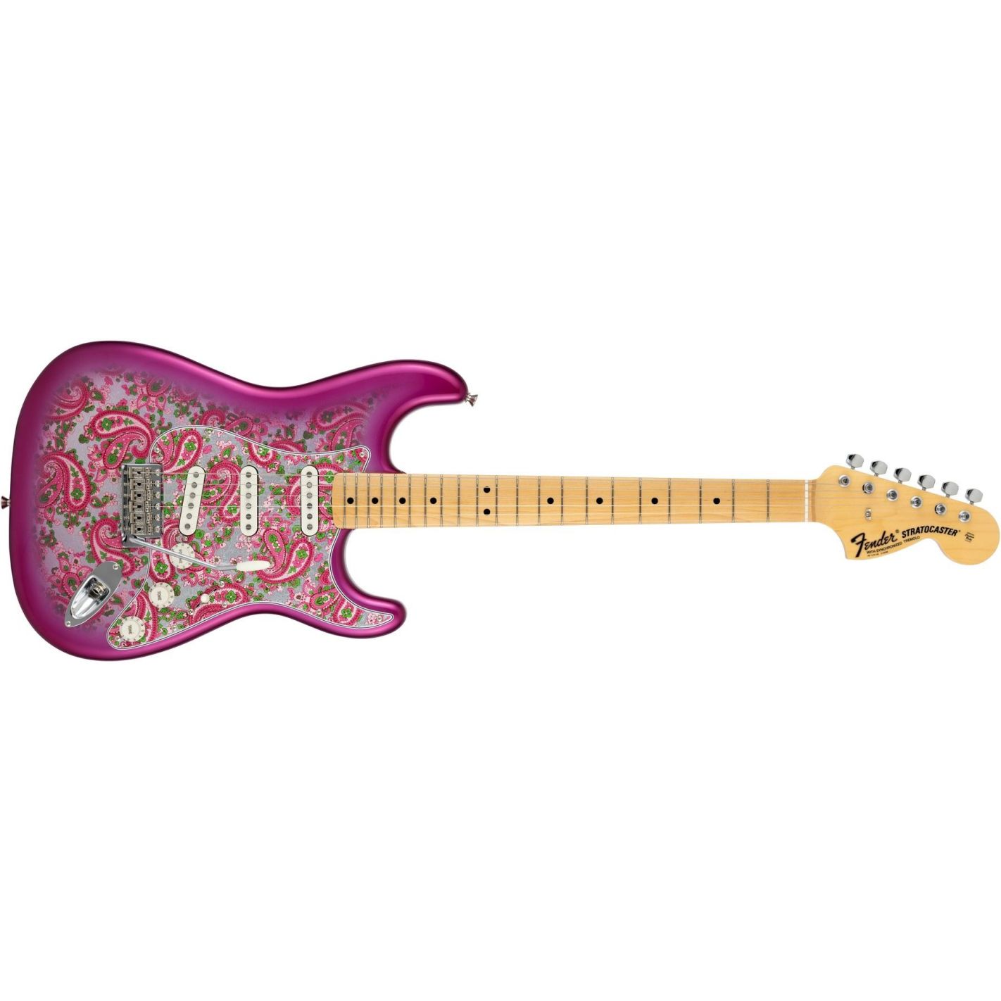Guitarra eléctrica Fender Made in Japan Limited Stratocaster, Maple Fingerboard, Pink Paisley - Cuerpo de aliso con acabado gloss polyester y forma Stratocaster. Mástil de arce en forma "U" de 1969 con acabado gloss urethane. Diapasón de arce con radio de 7.25" (184,1 mm), 21 trastes vintage, cejuela de hueso de 42 mm e incrustaciones tipo "dot" negras. Escala de 25.5" (648 mm). Pastillas Vintage-Style Single-Coil Strat en puente, medio y mástil (SSS). Controles Master Volume, Tone 1 (mástil/medio), Tone 2 (puente). Selector de 5 posiciones. Puente 6-Saddle Vintage-Style Synchronized Tremolo. Clavijeros Fender Vintage "F" Stamped. Golpeador Pink Paisley. Acabado del hardware niquelado/cromado. Incluye funda blanda.