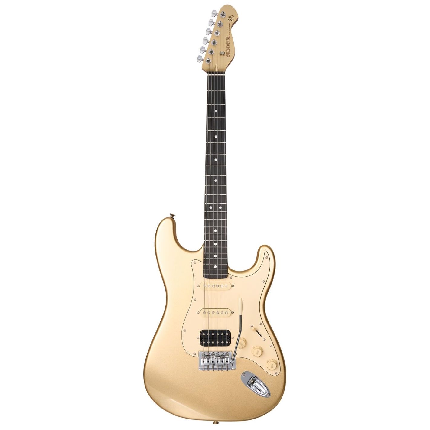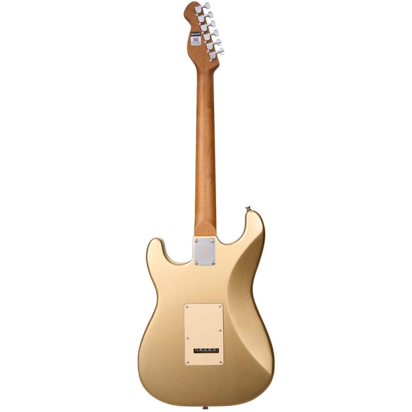 Guitarra eléctrica sólida Mooer MSC10 Elite Gold - Cuerpo de álamo con mástil atornillado de arce tostado en acabado satinado, diapasón de ébano técnico con 22 trastes de plata níquel e incrustaciones de puntos en concha blanca. Perfil de mástil en C estándar con cejuela de hueso, alma de acero de doble acción y clavijeros cromados MTN-1. Configuración de pastillas MSC-1N (mástil), MSC-1M (medio) y MHB-1B (puente), con selector de 5 posiciones, dos controles de tono y uno de volumen. Puente vintage MVT-1 de 6 puntos con trémolo. Incluye funda de transporte Mooer.