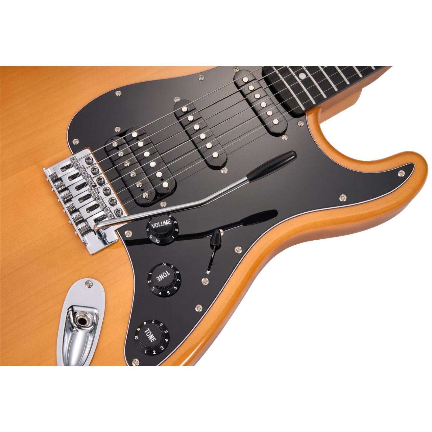 Guitarra eléctrica Mooer MSC10 Elite Natural Glossy - Cuerpo de álamo con mástil atornillado de arce tostado en acabado satinado. Perfil de mástil en C estándar con cejuela de hueso y alma de acero de doble acción. Diapasón de ébano técnico con incrustaciones de puntos de concha blanca, 22 trastes de plata níquel. Pastillas MSC-1N (mástil) / MSC-1M (medio) / MHB-1B (puente), con selector de 5 posiciones. Controles de volumen y 2 tonos. Puente Vintage MVT-1 de 6 agujeros con trémolo. Clavijeros cromados MTN-1. Incluye funda de transporte.