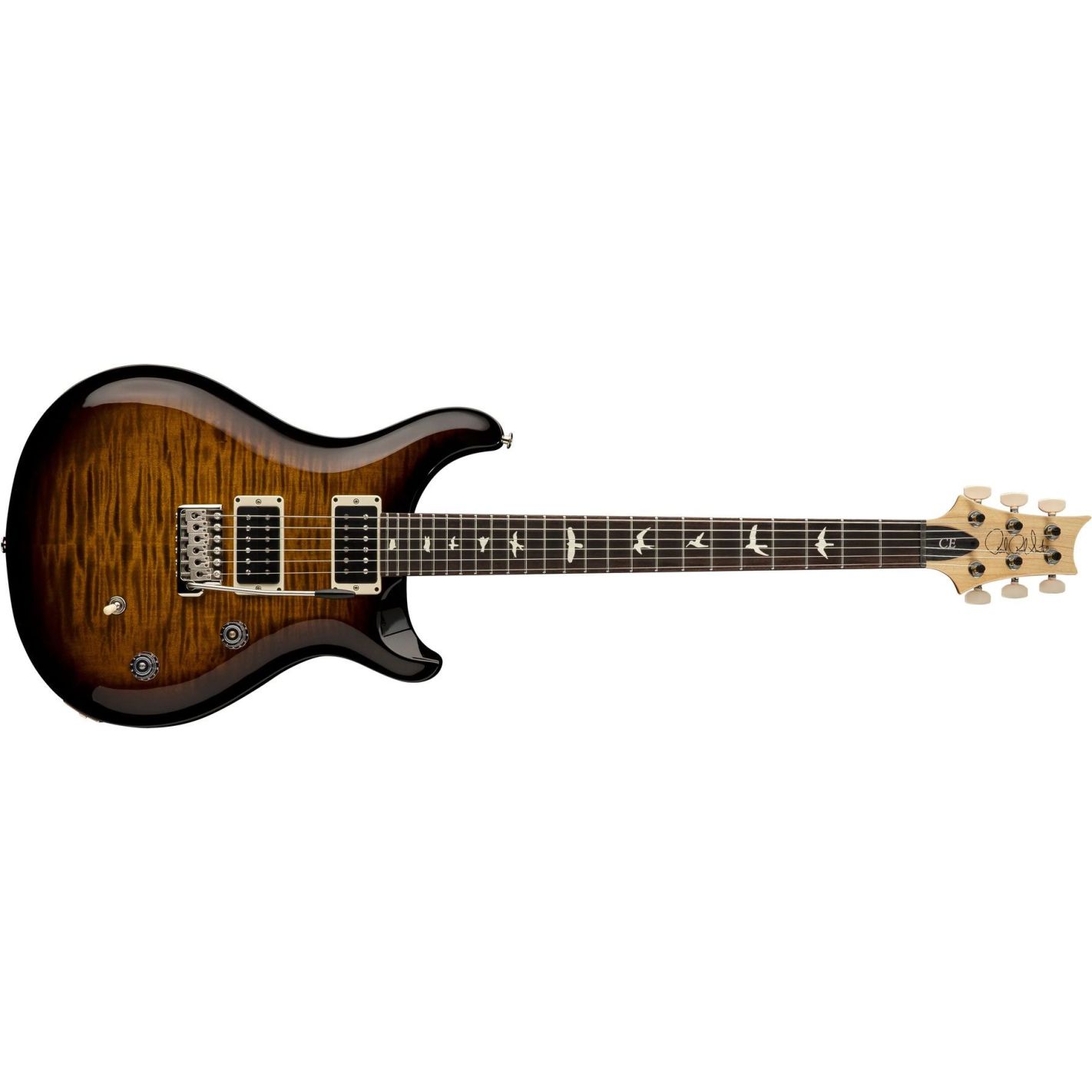 Guitarra eléctrica PRS CE 24 Black Amber - Cuerpo sólido de caoba con tapa de arce tallada tipo violin carve y acabado en nitrocelulosa de alto brillo. Mástil atornillado de arce con perfil Pattern Thin y acabado satinado, 24 trastes y escala de 25" (635 mm). Diapasón de palorrosa con radio de 10" e incrustaciones tipo “Birds”, logotipo PRS en decal. Cejuela PRS de 1 11/16". Pastillas PRS 85/15 (mástil y puente) sin cubierta, controladas mediante potenciómetro de volumen y tono push/pull, junto a un selector de 3 posiciones que ofrece seis configuraciones clásicas. Puente PRS Patented Tremolo y clavijeros PRS Low Mass Locking Tuners. Herrajes niquelados. Incluye funda Premium Gig Bag.