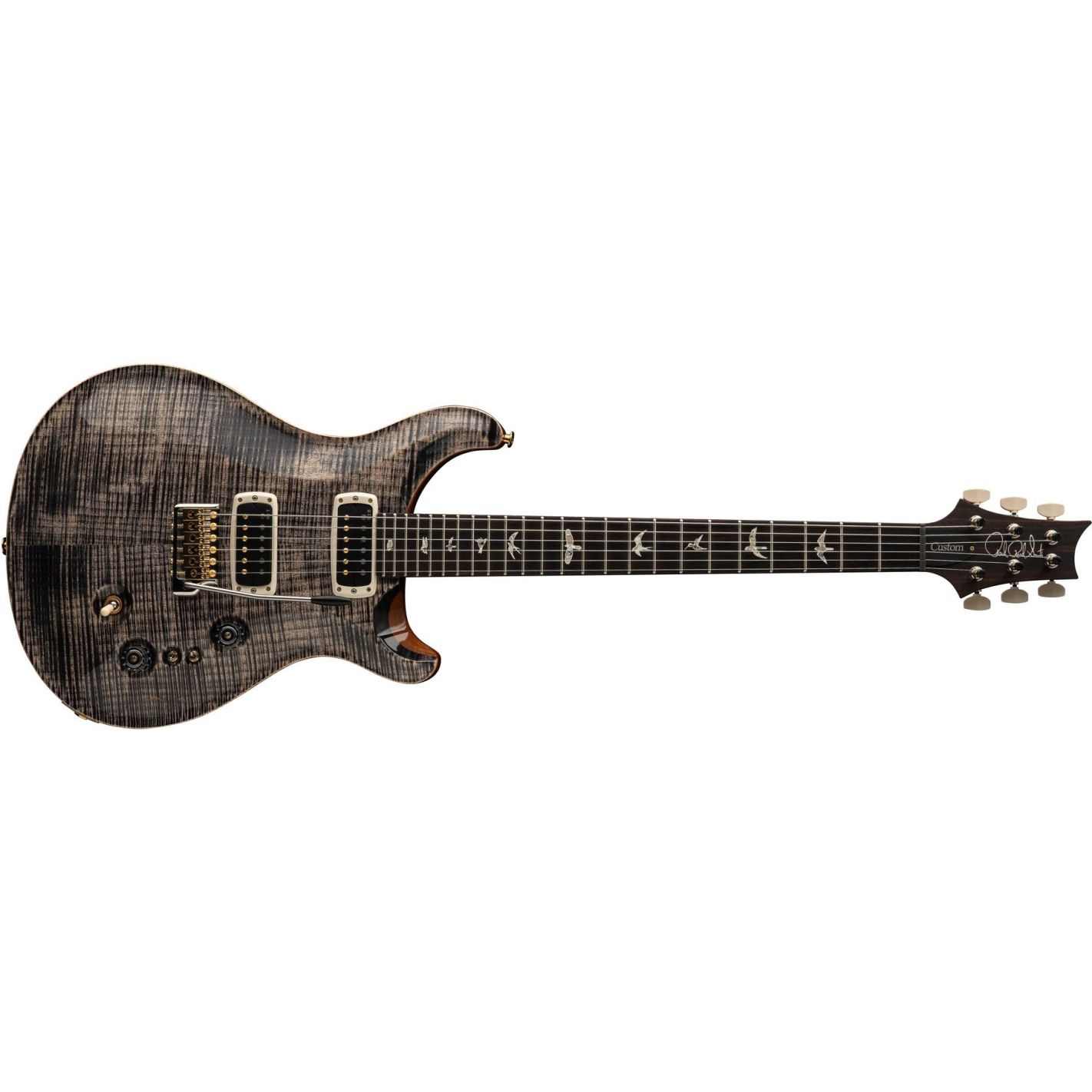 Guitarra eléctrica PRS Custom 24-08, Charcoal - Cuerpo sólido con tapa de arce tallado tipo “violin” y fondo de caoba. Mástil de caoba en una sola pieza con perfil Pattern Thin y escala de 25”, diapasón de palosanto con radio de 10” e incrustaciones “Birds”. 24 trastes. Unión mástil-cuerpo encolada. Pastillas PRS TCI Treble y Bass con controles de volumen y tono, selector de 3 posiciones y dos mini conmutadores EQ de alta frecuencia para mayor versatilidad tonal. Puente PRS Gen III Tremolo y clavijeros bloqueantes PRS Phase III con botones “wing”. Cejuela PRS. Acabado en nitrocelulosa brillante. Hardware niquelado. Incluye estuche rígido.