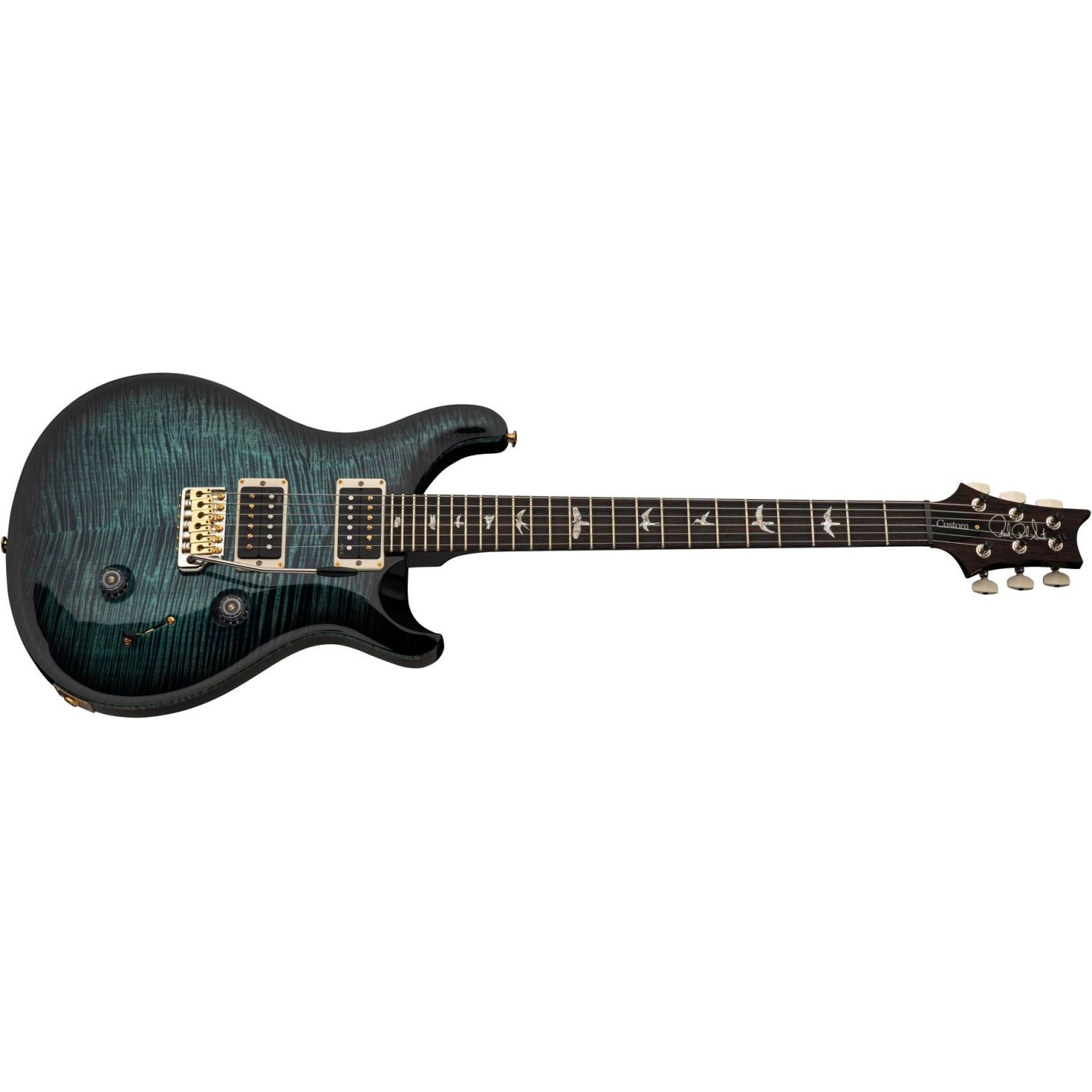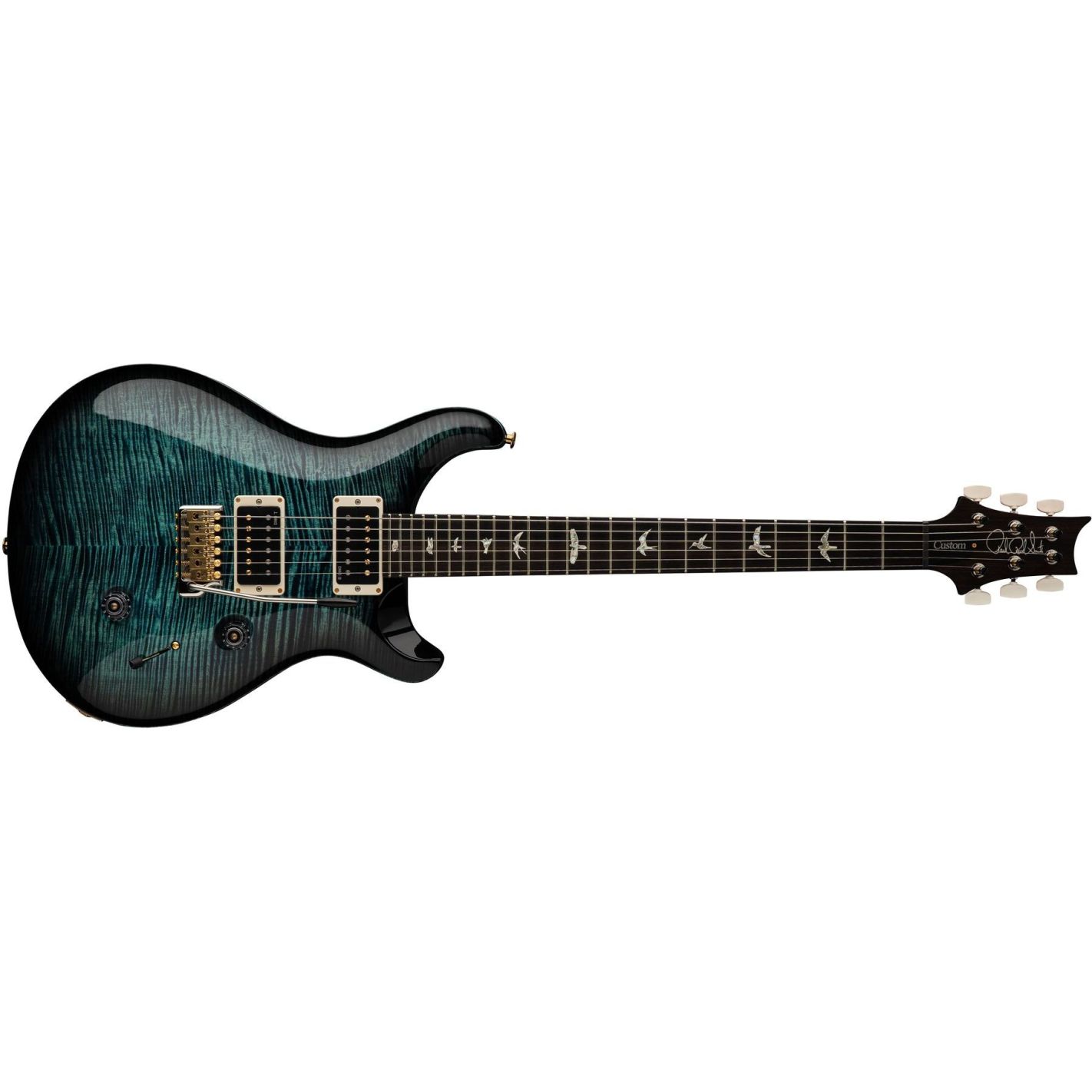 Guitarra eléctrica PRS Custom 24, Cobalt Smokeburst - Cuerpo sólido con tapa de arce tallado tipo “violin” y fondo de caoba. Mástil de caoba en una sola pieza con perfil Pattern Thin y escala de 25”, diapasón de palosanto con radio de 10” e incrustaciones tipo “Birds”. 24 trastes. Unión mástil-cuerpo encolada. Pastillas PRS DMO Treble y Bass con controles de volumen y tono y selector de 5 posiciones. Puente PRS Gen III Tremolo patentado y clavijeros bloqueantes PRS Phase III con botones tipo “wing”. Cejuela PRS. Acabado en nitrocelulosa brillante. Hardware niquelado. Incluye estuche rígido.